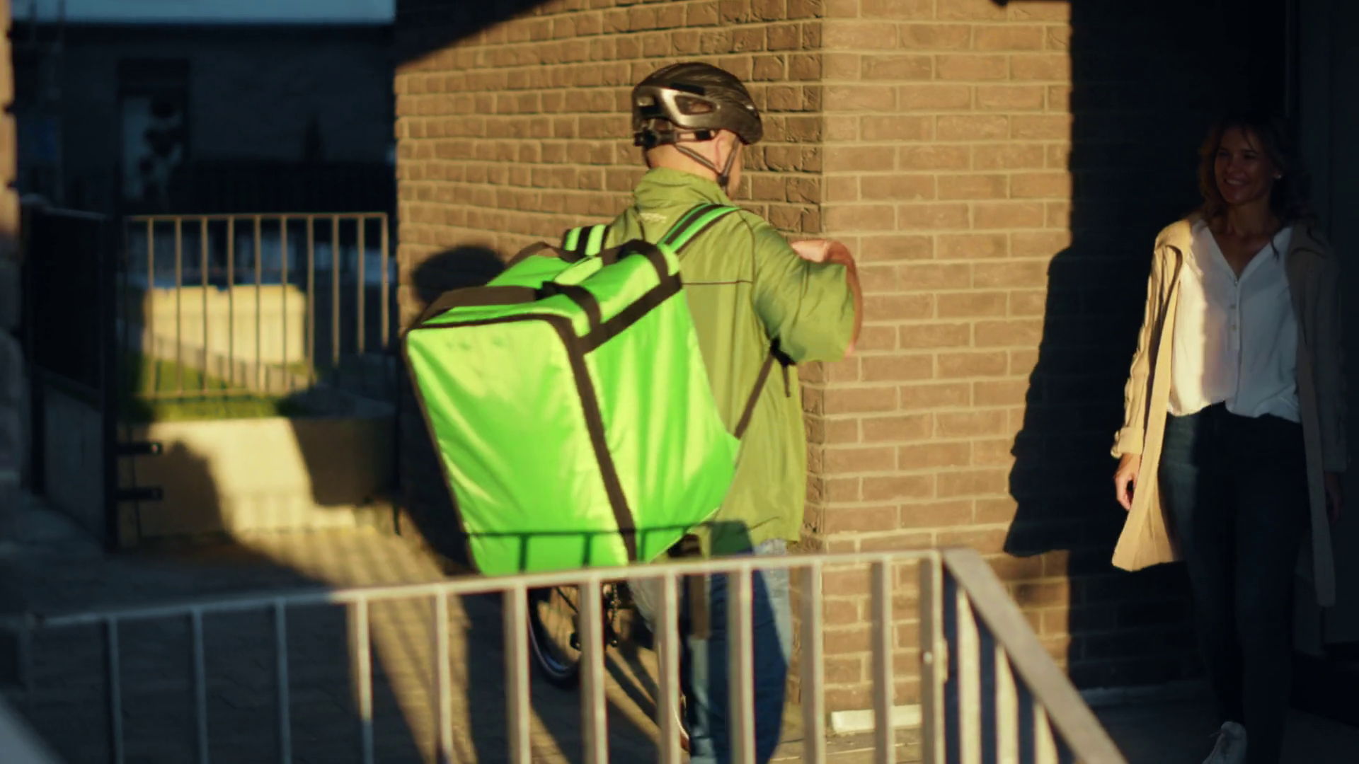 Close Up At Sunlight View Man Courier In A Safety Helmet Delivering Food In A Paper Bag To The Customer Home By Bicycle Attractive WomanÂ