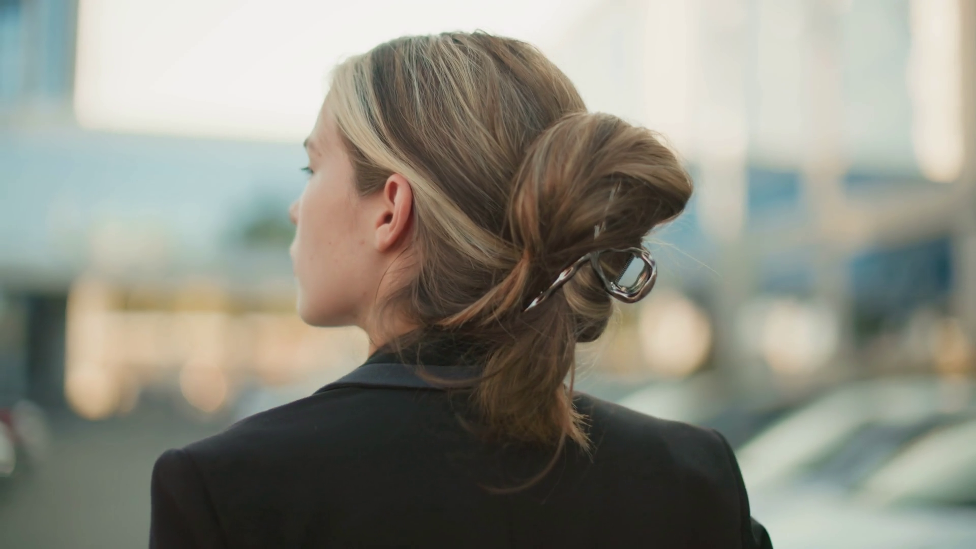 Close Up Back View Of Woman With Neatly Clipped Hair Glancing Left With Blurred Background Of Parked Cars And Modern Building In CityÂ
