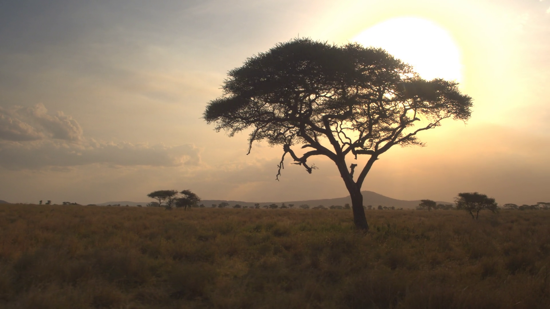 Close Up Big Lush Acacia Tree Against Golden Setting Sun In African SavannahÂ