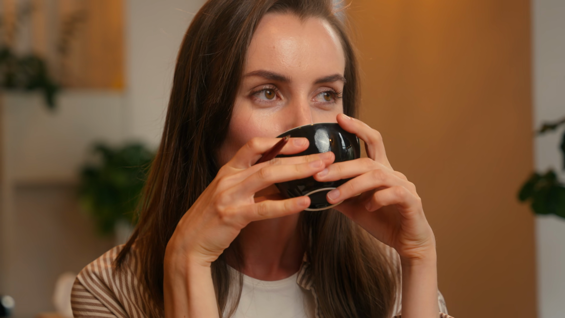 Close Up Happy Inspired Caucasian Woman In Cafe Drinking Coffee Writing Notes Carefree Businesswoman Drink Tea Smiling Enjoying BreakfastÂ