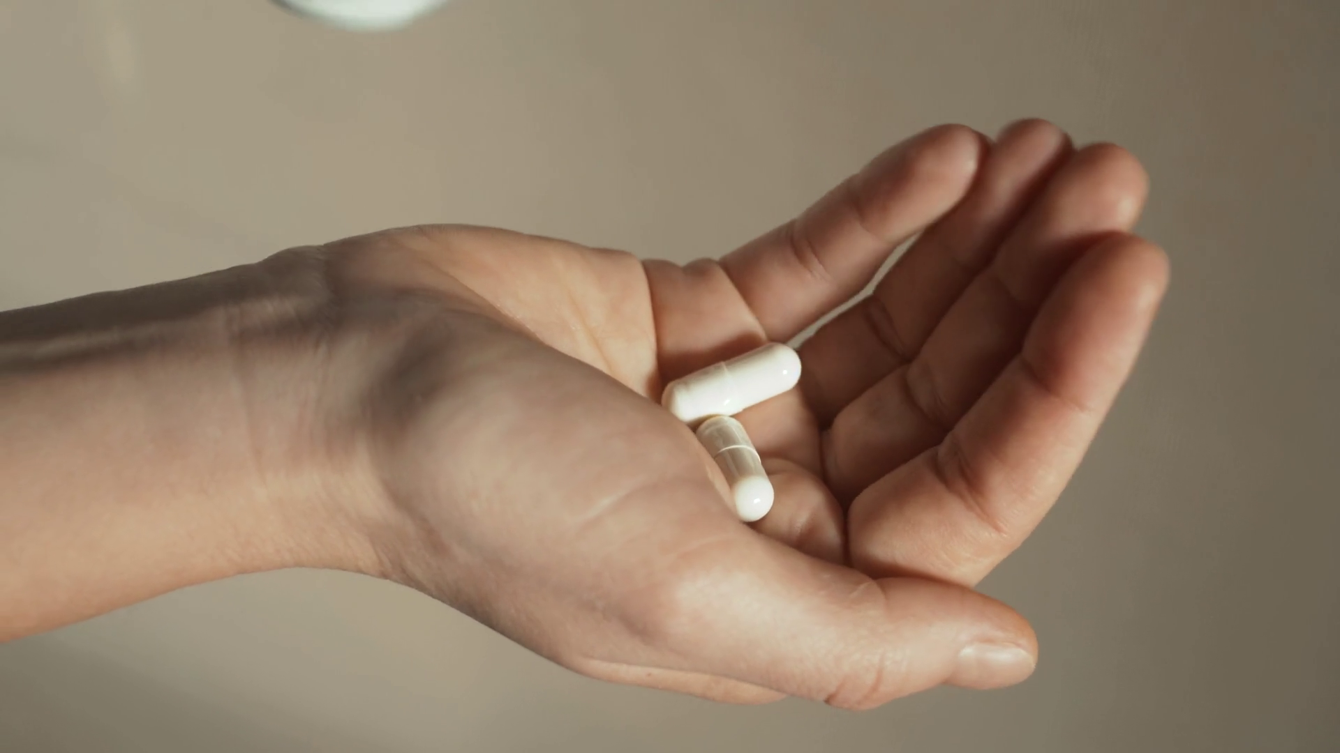 Close Up Medicine Pills Or Capsules In Hand Woman Medicine MacroÂ