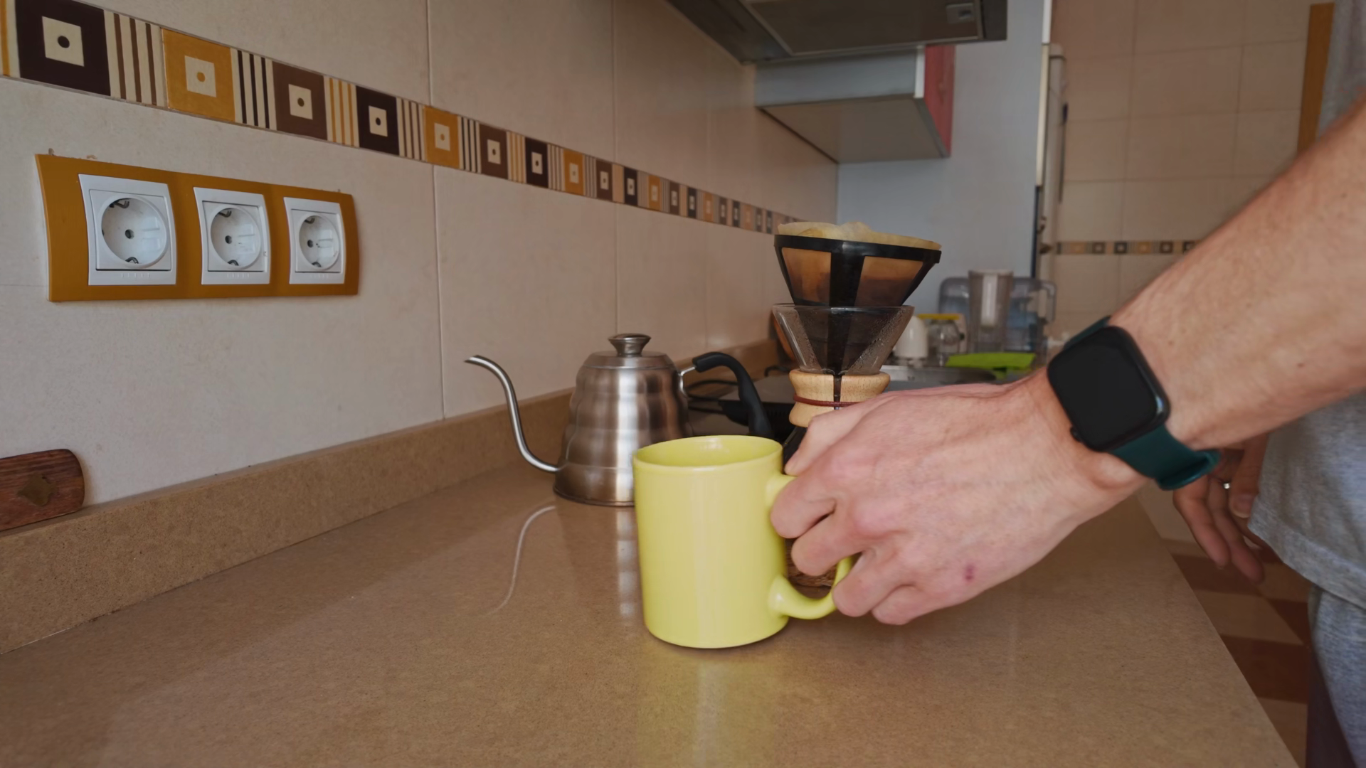 Closeup Of A Hand Pouring Freshly Brewed Coffee From A Glass Carafe Into A Yellow Mug In A Kitchen Capturing The Comforting Daily Routine Of Making And Enjoying Morning CoffeeÂ