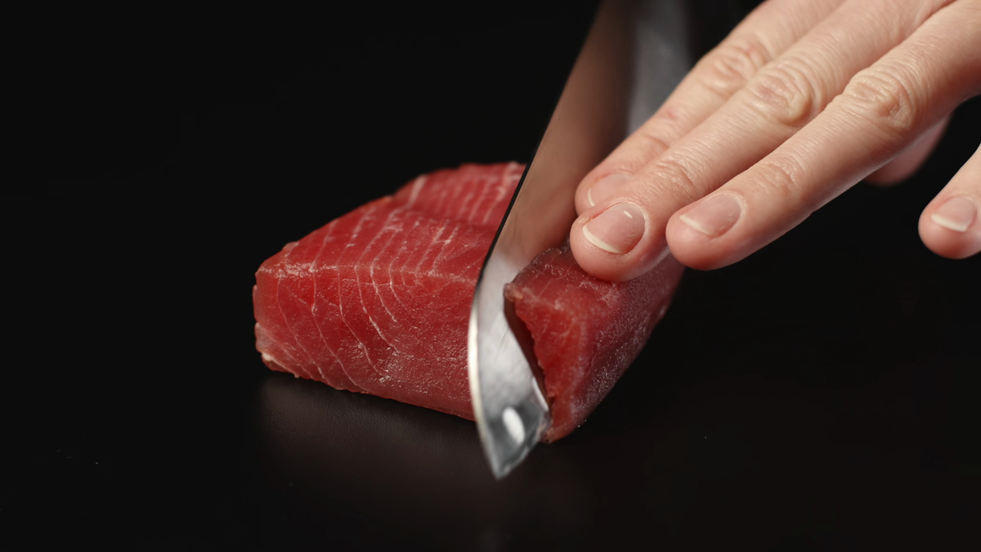 Closeup Of A Professional Sushi Chef Carefully Slicing A Fresh Raw Tuna SteakÂ