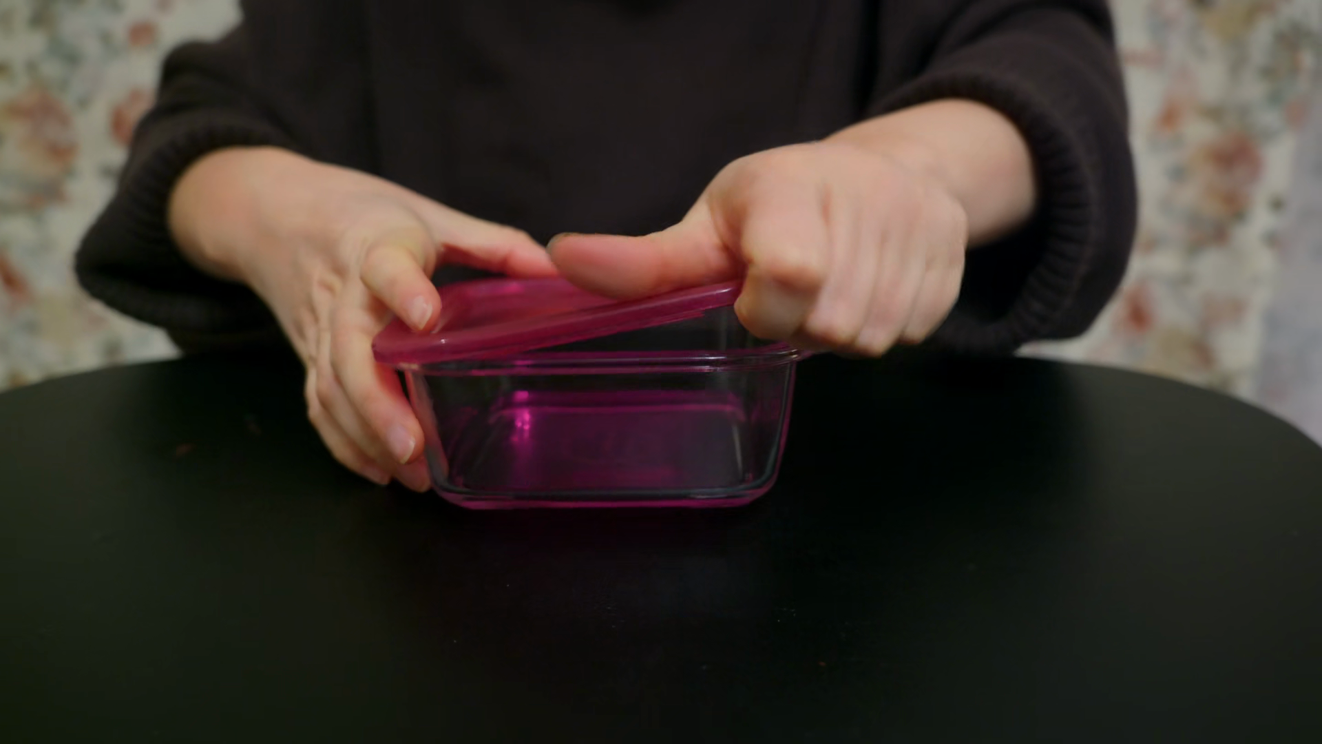 Close Up Of A Womans Hands Sealing And Then Opening A Reusable Glass Food Storage Container With A Pink Plastic Lid The Container Sits OnÂ