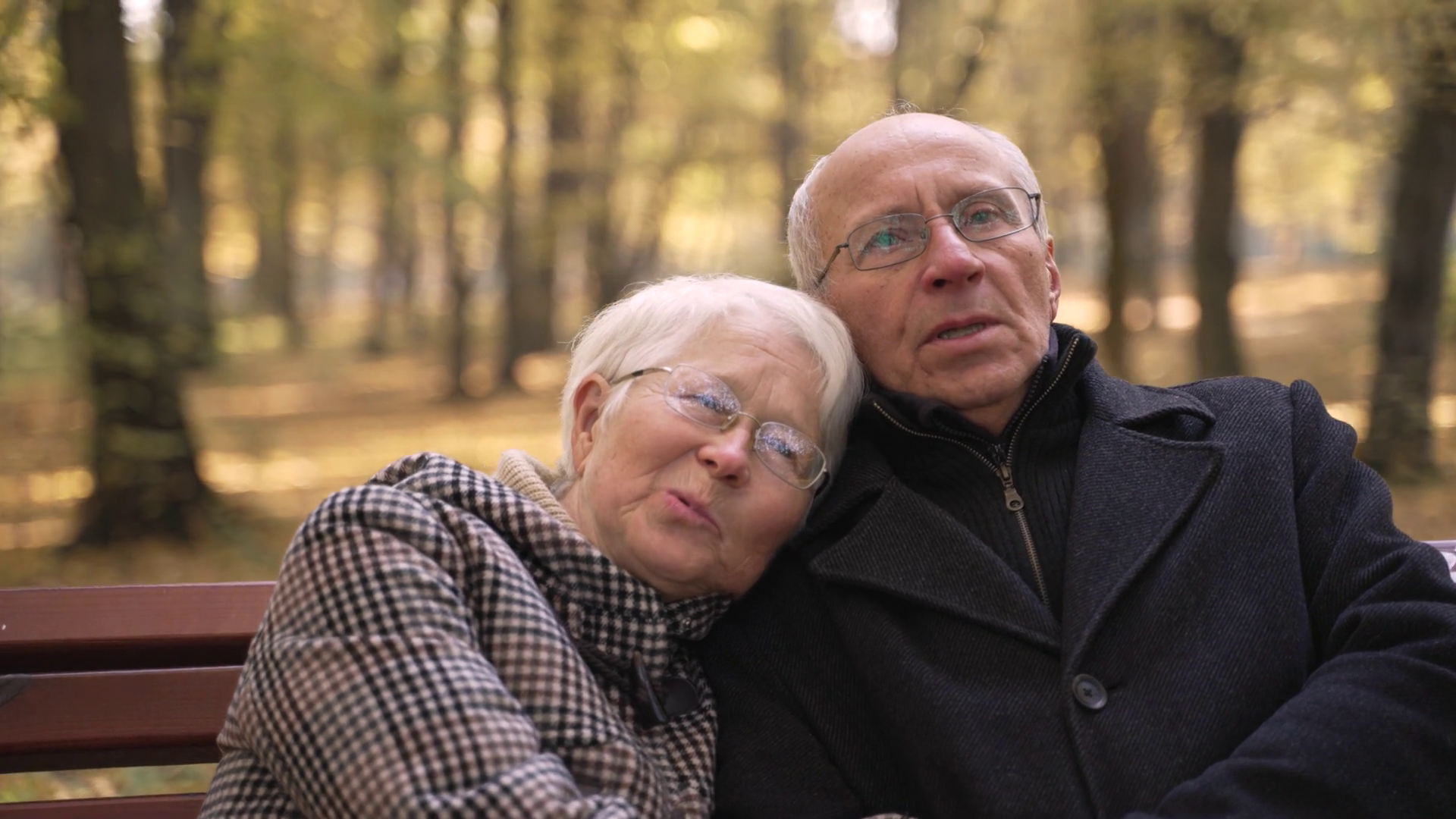 Closeup Of Elderly Husband And Wife Talking While Sitting Holding Hands On Bench In Autumn Park Loving Aged Couple Enjoing Relaxation And Conversation During Joint Outdoor Leisure ActivityÂ