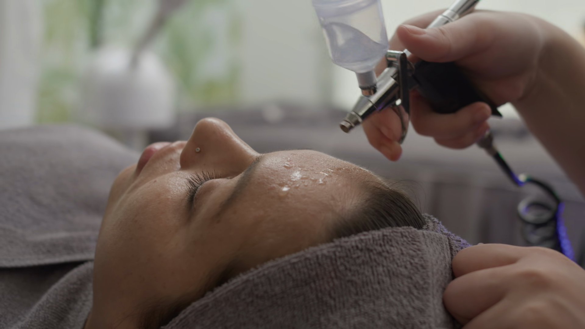 Close Up Of Hands Of Unrecognizable Beautician Reducing Wrinkles On Forehead Of Caucasian Woman With Microderm Spraying MachineÂ