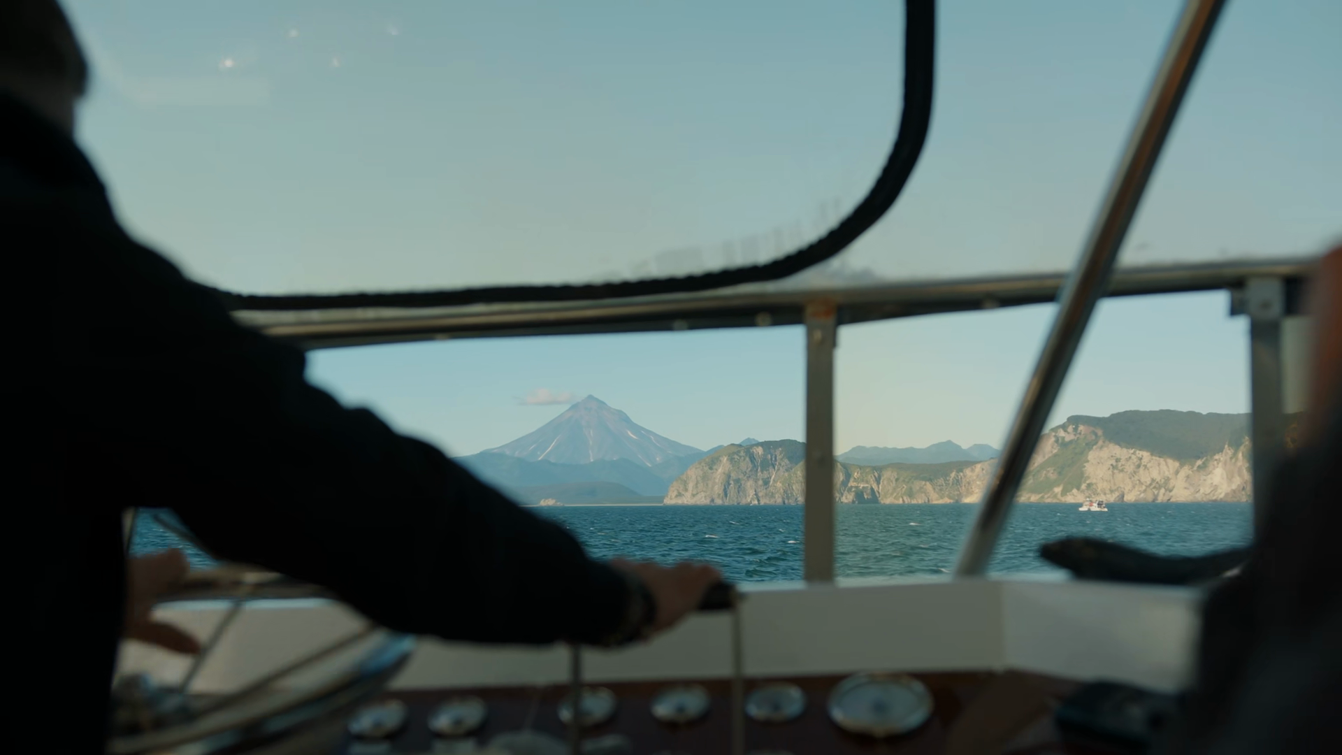 Closeup Of Skippers Hands At Ships Helm And Control Panel In Yachts Wheelhouse With View Out Window Of Mountains And Volcano On BayÂ