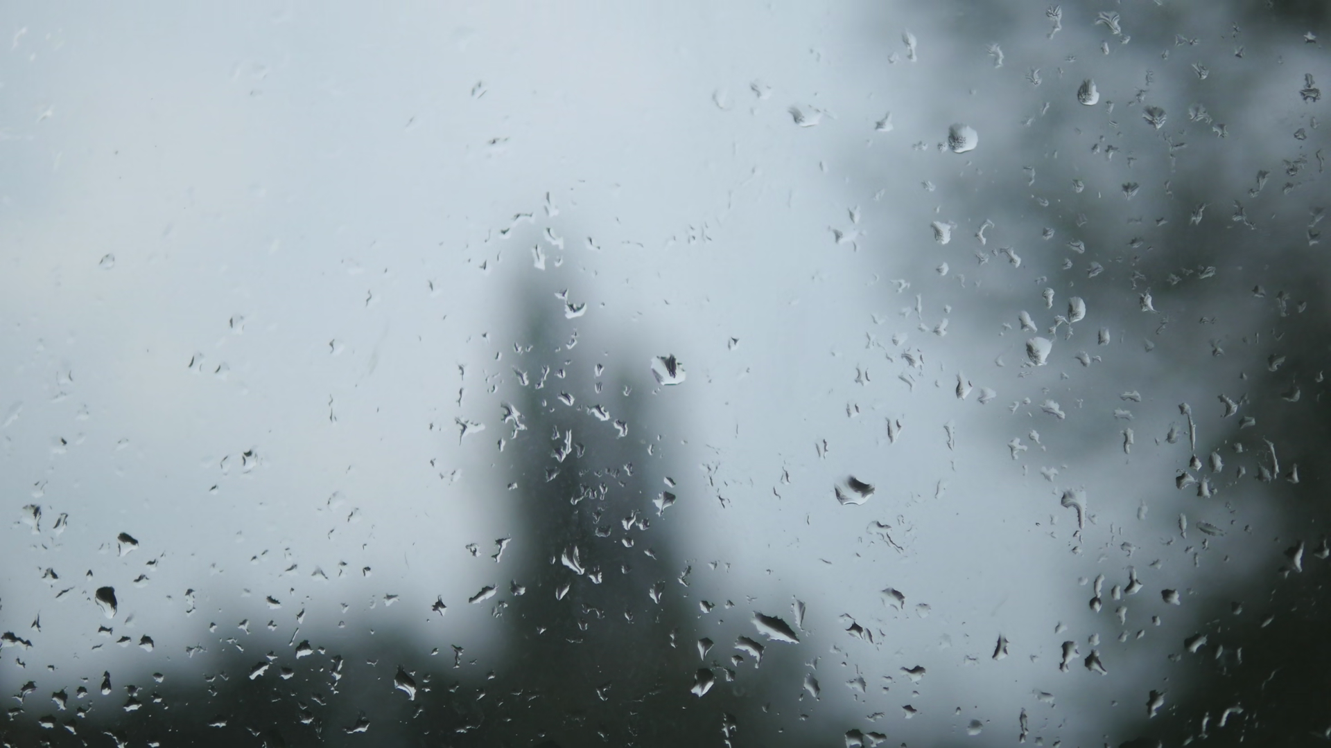 Closeup Of Water Droplets On Glass Rain Drops On Window Glass With Blur Background Blurred Tree And Sky Rainy Days Rain Running Down Window BokehÂ
