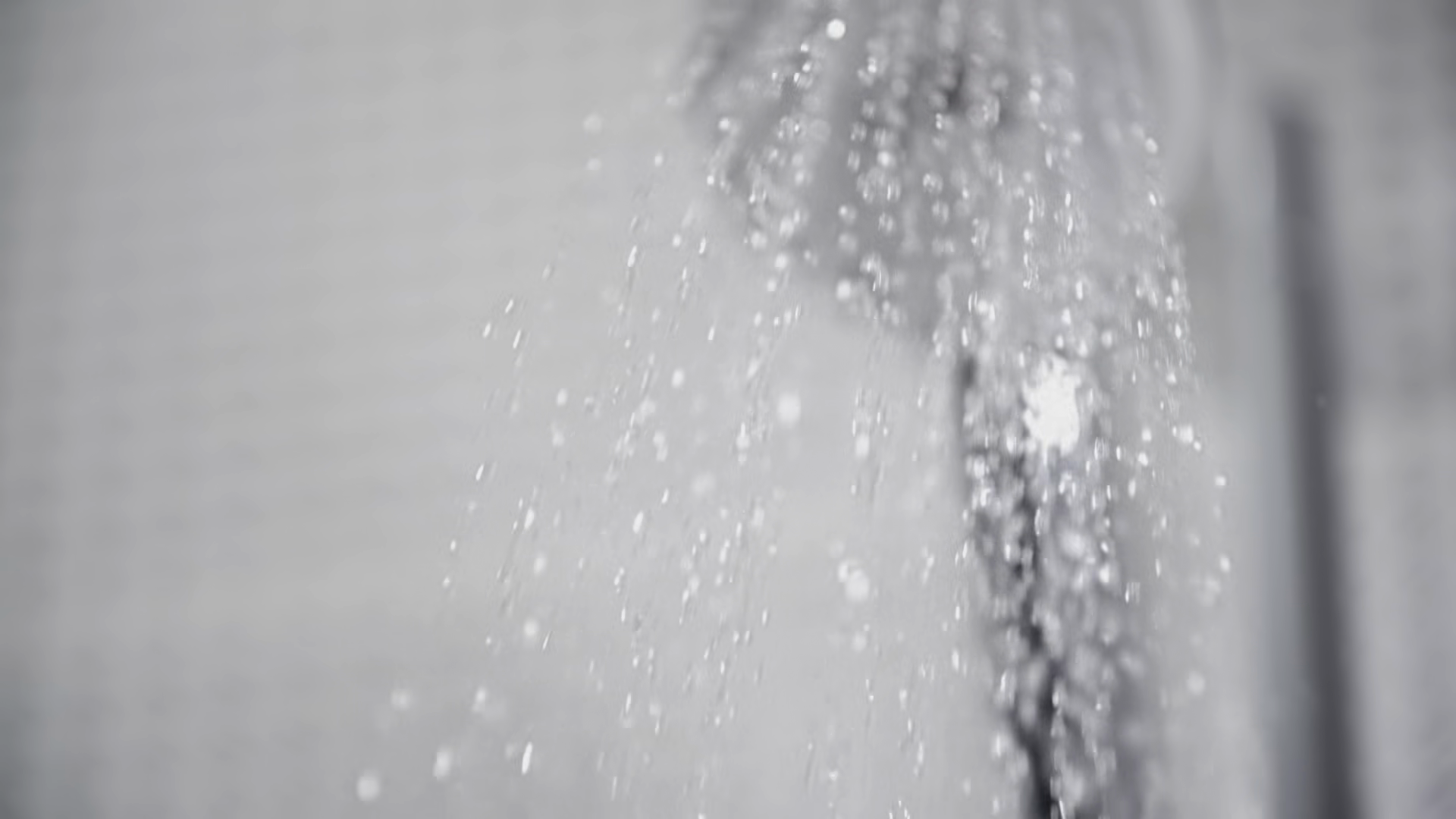 Closeup Of Water Flowing From The Shower Head In Bathroom White Tiles With Black Pattern On The Walls Focus On Falling Water Drops Shot In Slow MotionÂ
