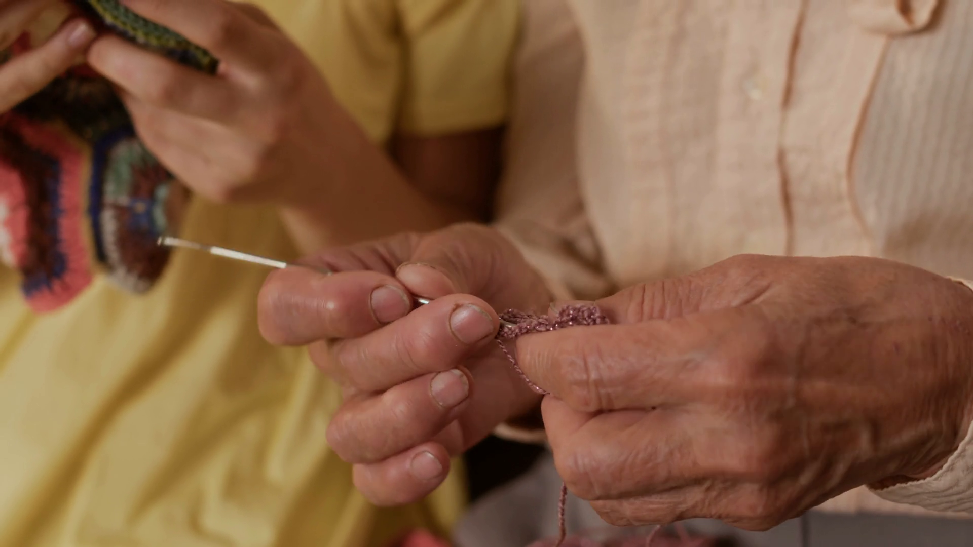 Close Up Of Wrinkled Hand Of Elderly Woman Knitting Scarf With Needle While Teaching Granddaughter Crafting Technique Spending Weekend Together At Home Copy SpaceÂ