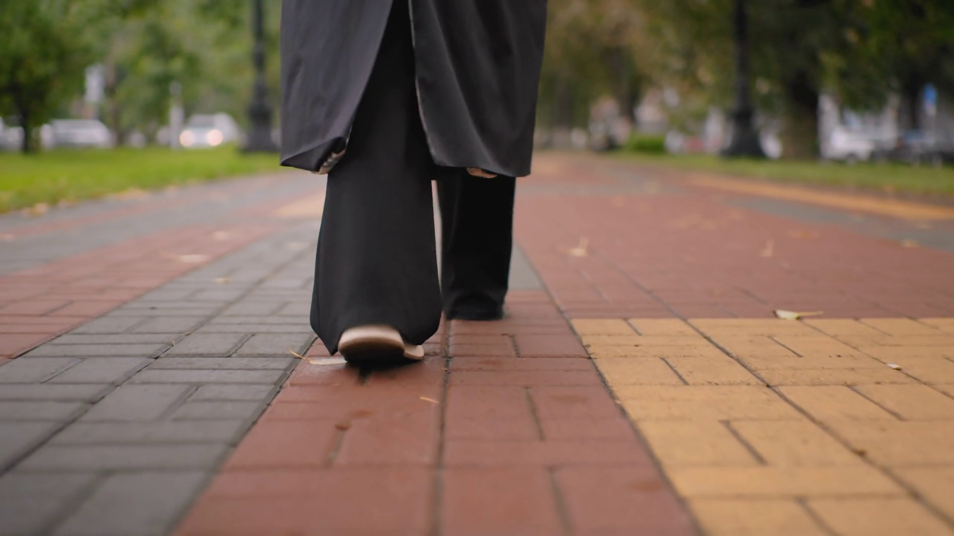 Closeup Of Young Woman Walking On Park Pathway In Black Coat And Sneakers One Foot Lifted Midstep Autumn Leaves Scattered On GroundÂ