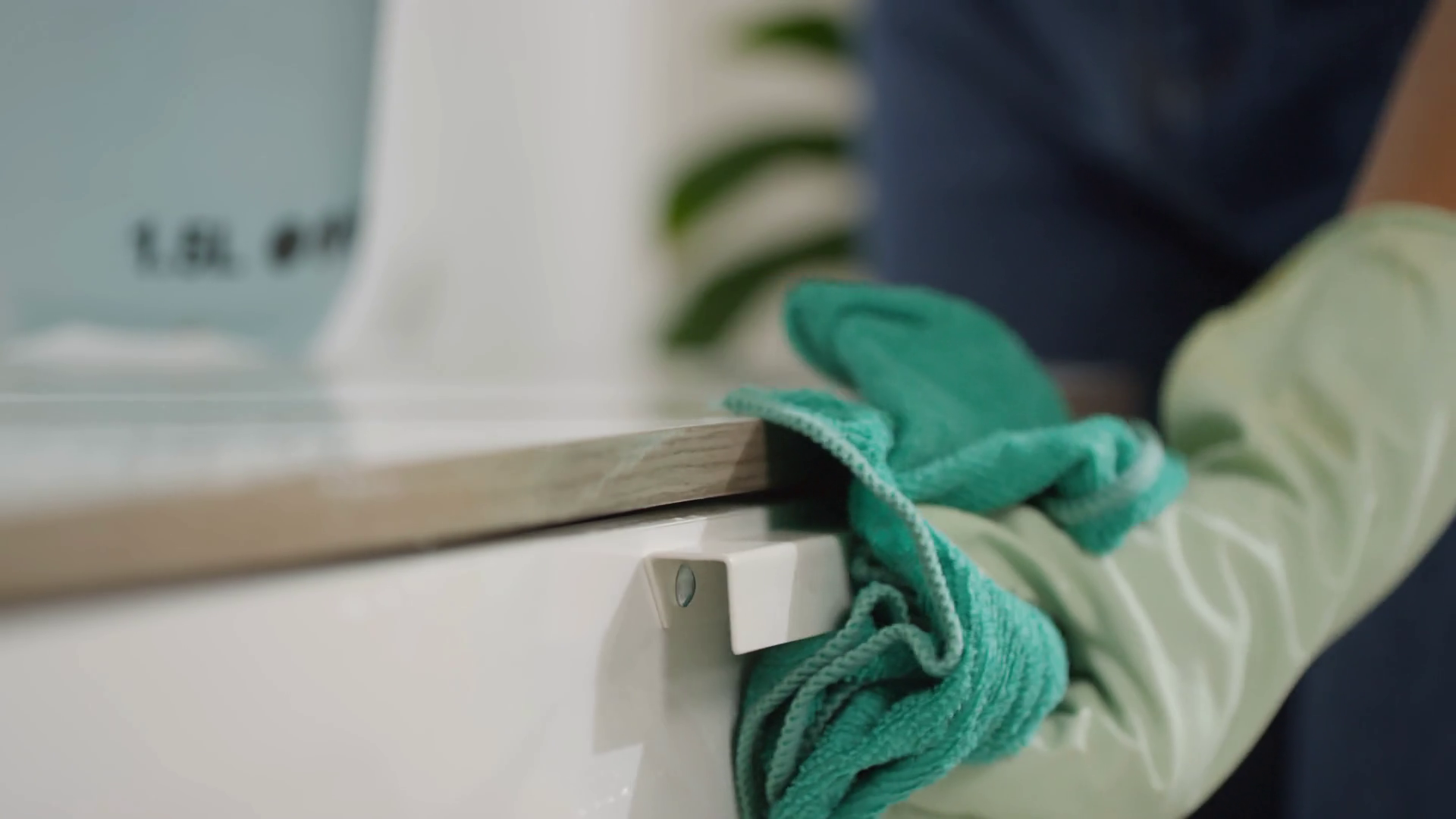 Close Up Shot Of Hands Of Unrecognizable Woman Wearing Gloves Spraying Sanitizing Spray On Surface Of Cabinet And Wiping It With Microfiber ClothÂ