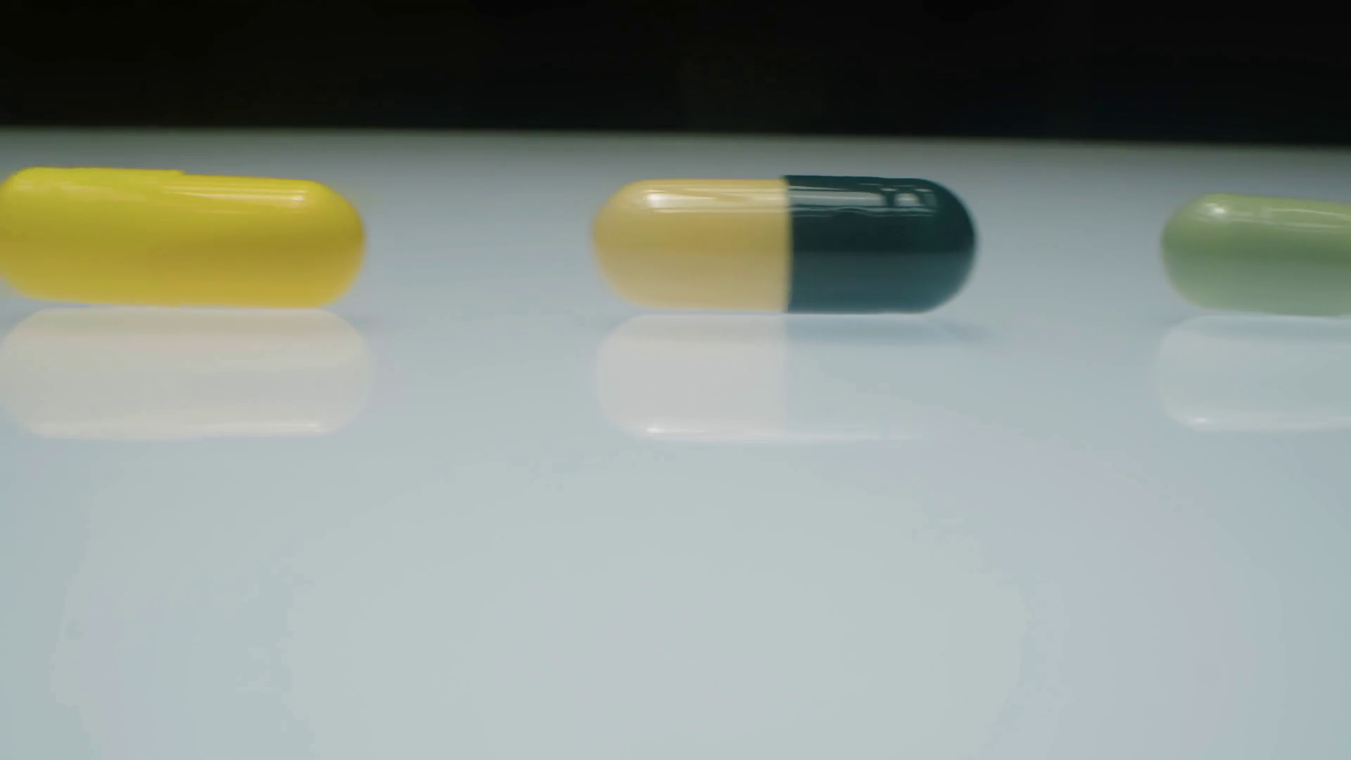 Close Up Tracking Shot Of Different Medicine Pills And Capsules With Granules In Row On White Glass Table With Reflective Surface In Dark StudioÂ