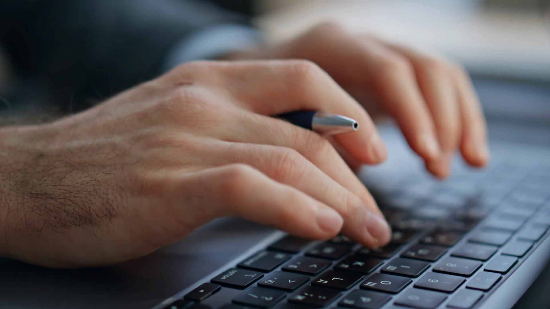 Close Up View Of Businessman Typing On Laptop While Holding A Pen Â