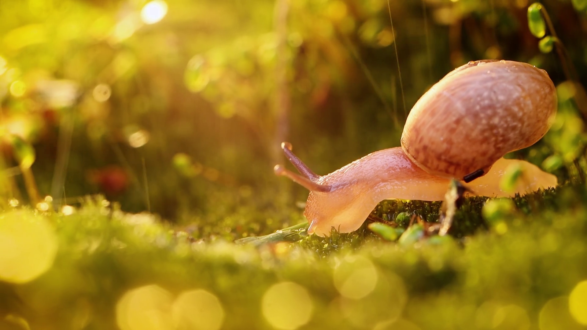 Closeup Wildlife Of A Snail In Heavy Rain In The Sunset Sunlight