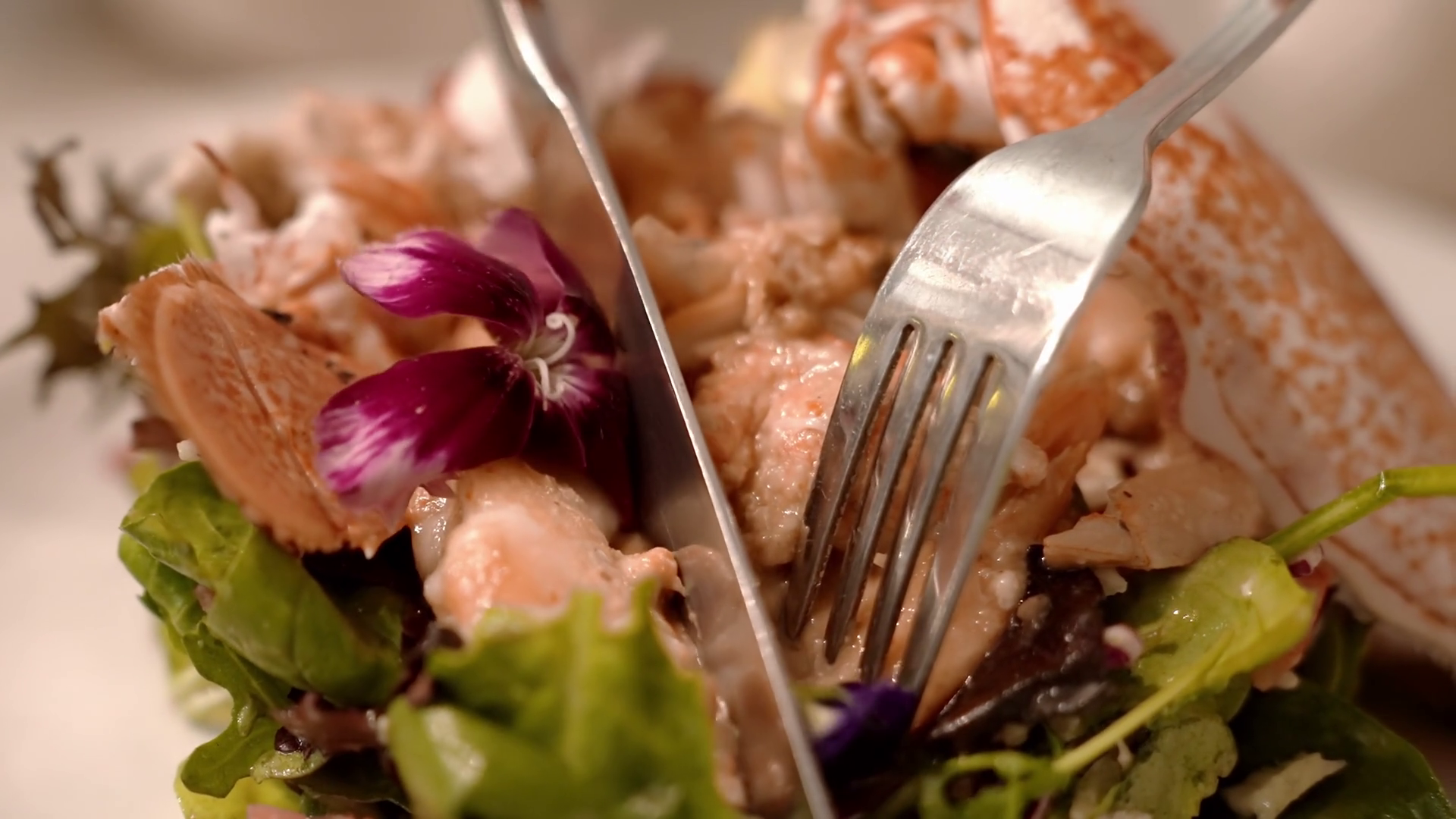 Closeup 4k Video Of Hand Cutting Roasted Salmon Steak And Lobster With Shrimps On A White Plate With VegetableÂ
