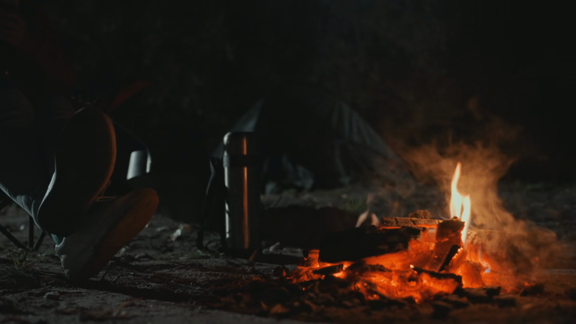 Closeup Campfire Embers Beside Tent Glowing Coals And Steaming Thermos Dark Forest Background Faint Smoke Curling Rustic Gear ScatteredÂ