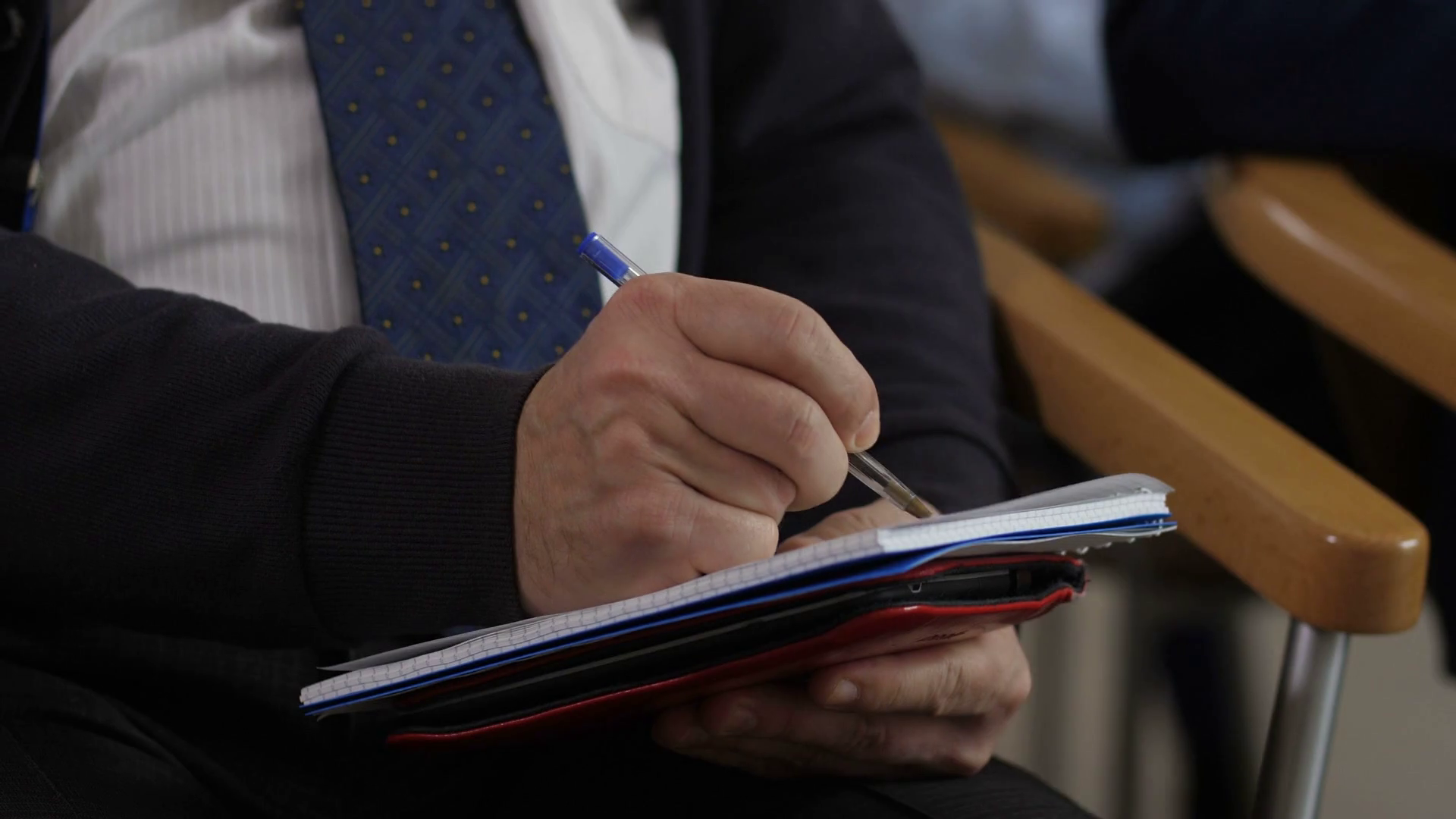 Closeup Hans Of Middle Aged Marketing Manager Making Notes With Pen In Notepad During Speech At Business ConferenceÂ