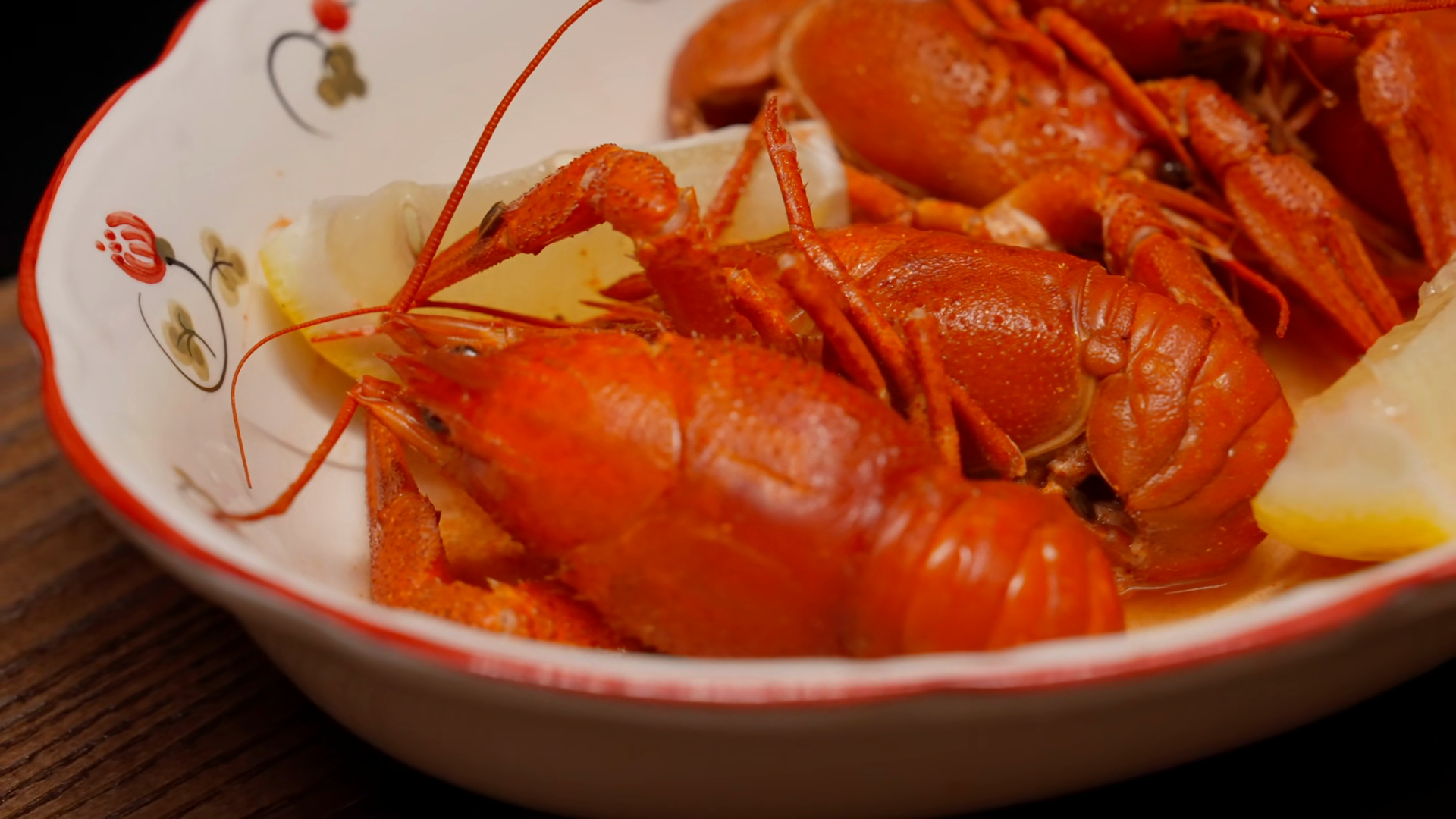 Closeup Of Freshly Cooked Red Crayfish Served In A Decorative White Bowl With Lemon Wedges Highlighting Juicy Seafood Texture And VibrantÂ