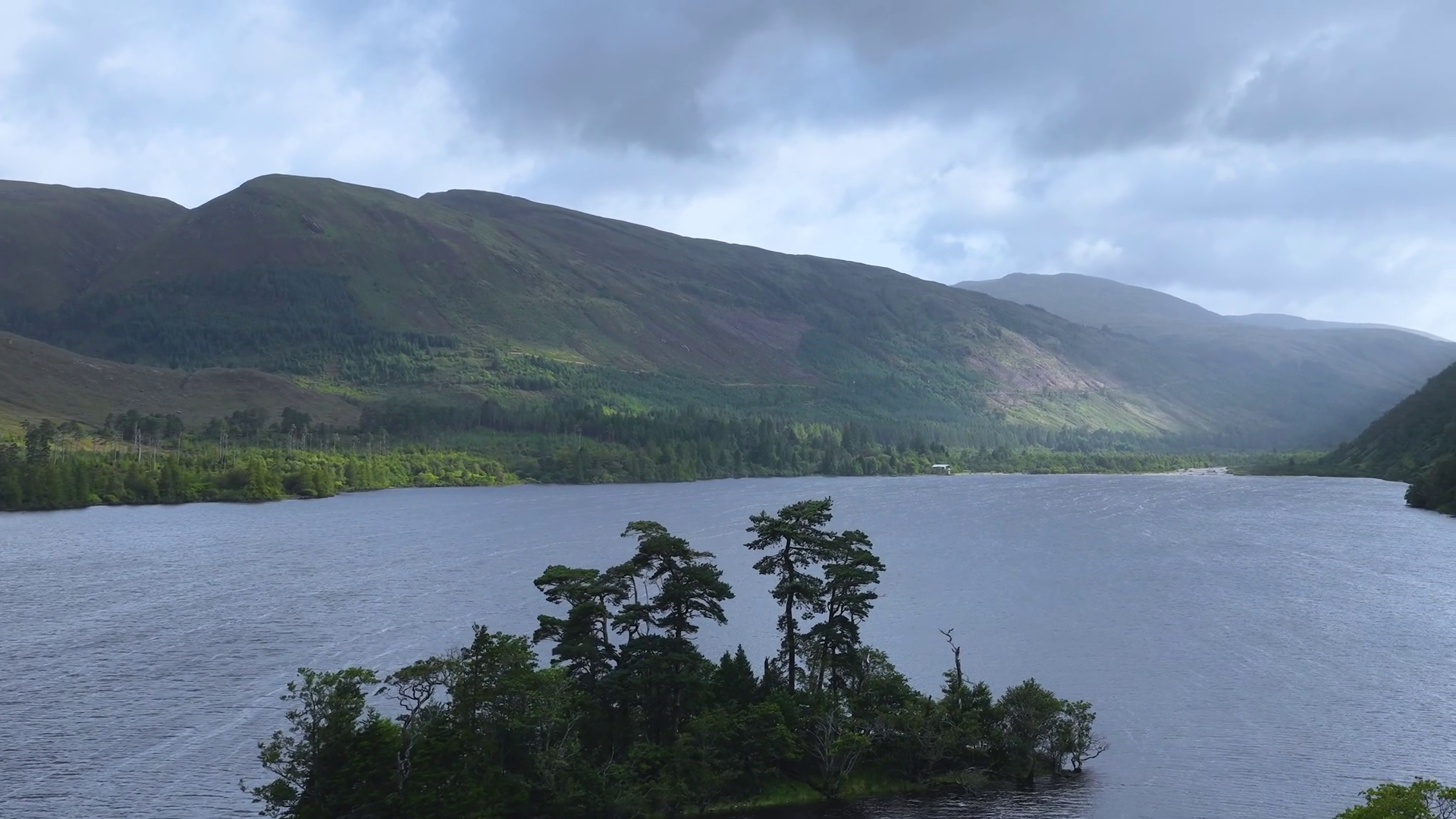 Cloudy Pan Over Lake And Forested Highlands LandscapeÂ