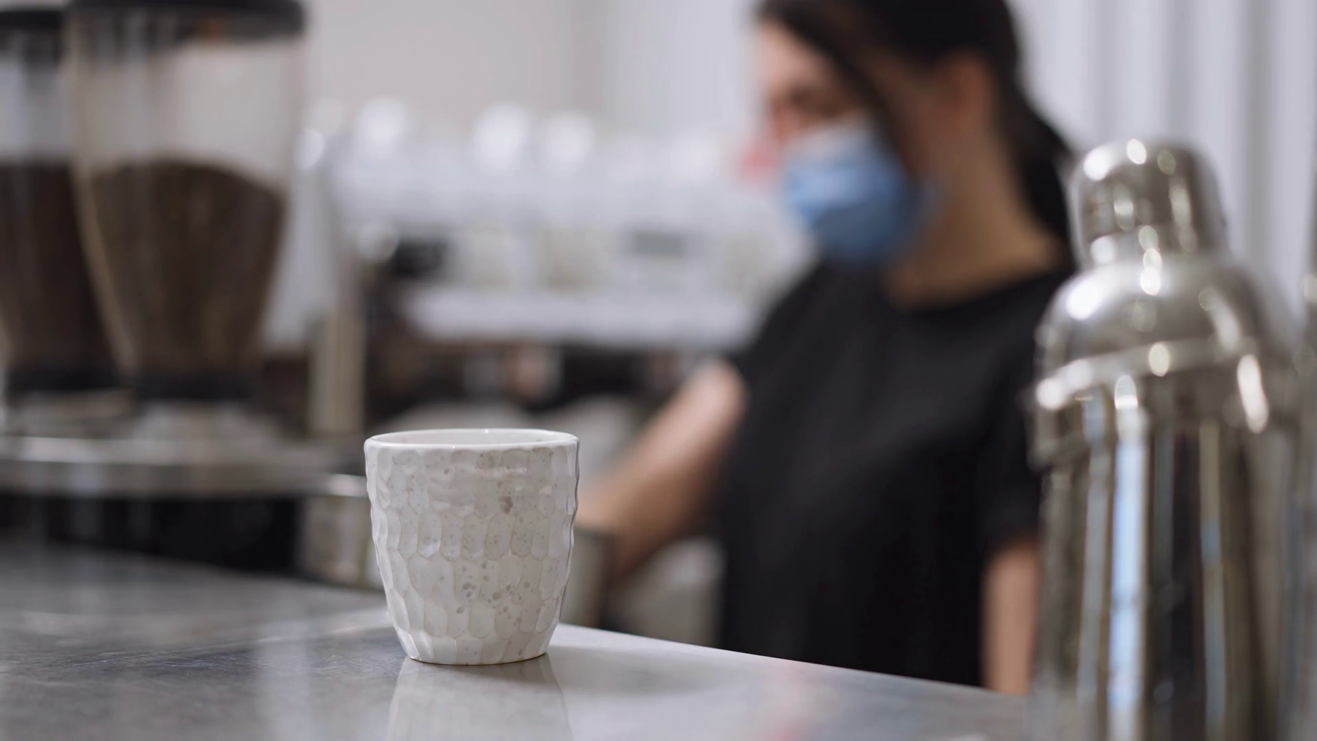 Cup On Counter With Woman In Face Mask Making Hot Drink Barista Preparing Cappuccino Latte In Cafe Slow MotionÂ