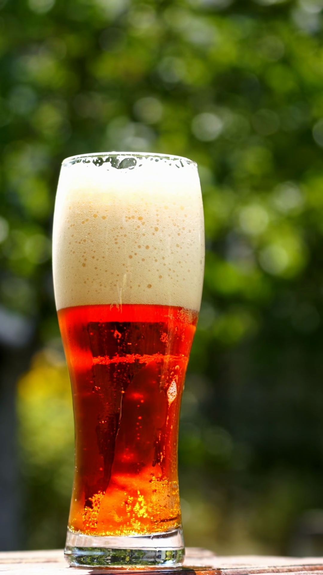 Cold Beer In A Glass With White Foam Craft Beer In A Glass With Small Bubbles Inside Cool Brown Beverage On A Table Outdoors Closeup Vertical VideoÂ