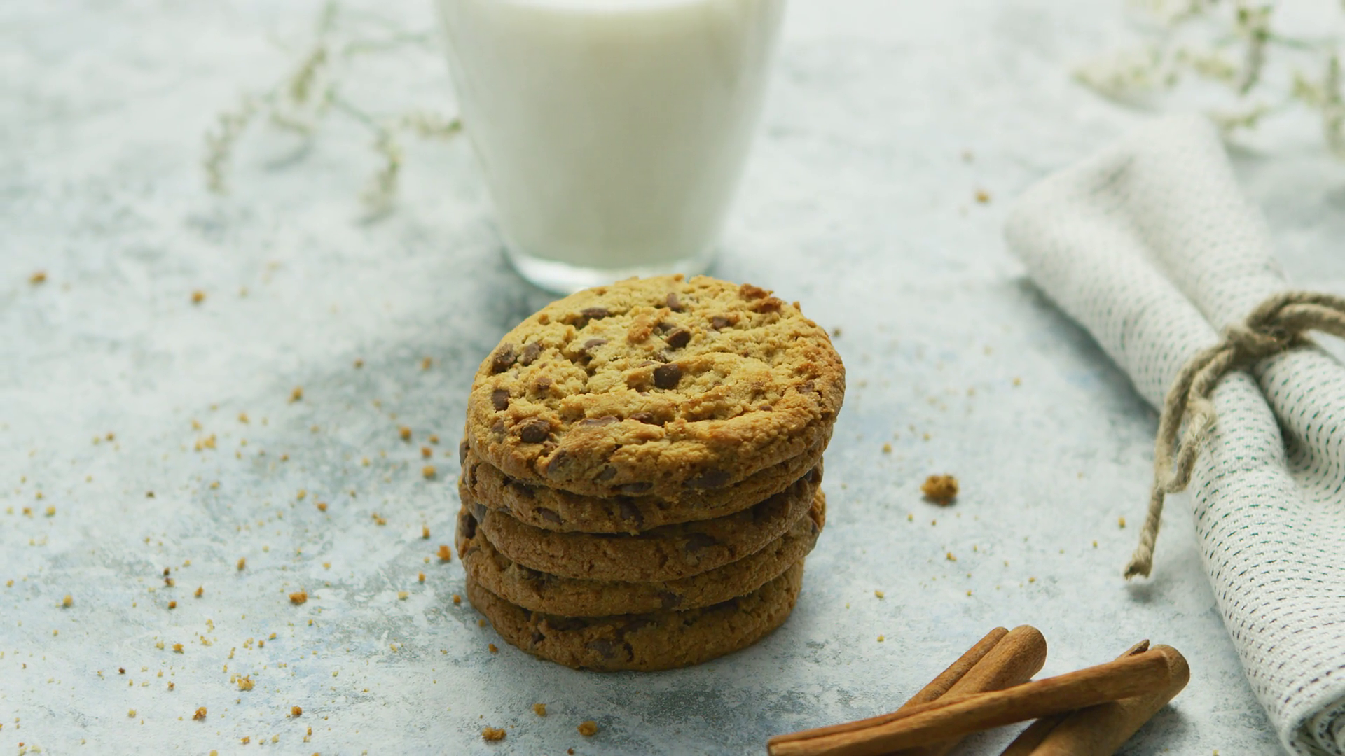 Composed Stack Of Delicious Chocolate Chip Cookies On Table With Cinnamon Sticks And Glass Of MilkÂ