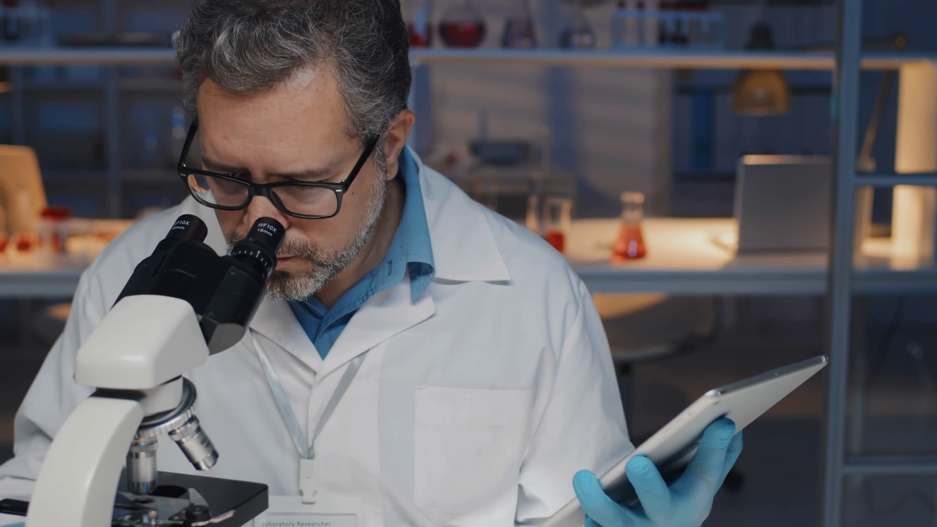 Confident Experienced Researcher Or Clinician Studying Characteristics Of Stem Cells In Microscope And Using Tablet While Entering Data Describing Labgrown SubstanceÂ