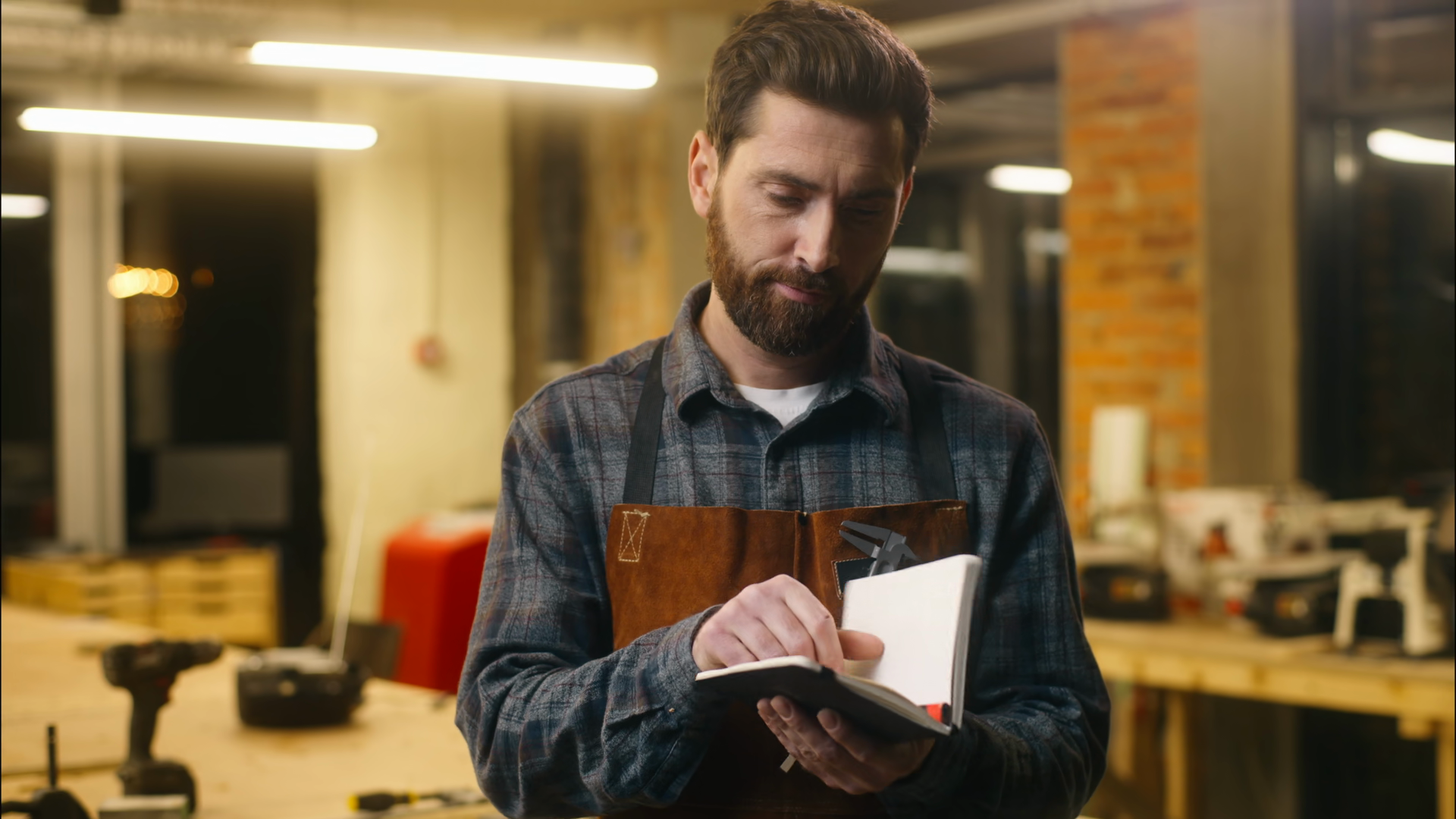 Contemplative Caucasian Guy Thinking Writing Notebook In Workshop Male Wood Master Joiner Carpenter Lost In Thought Confused Artist ManÂ