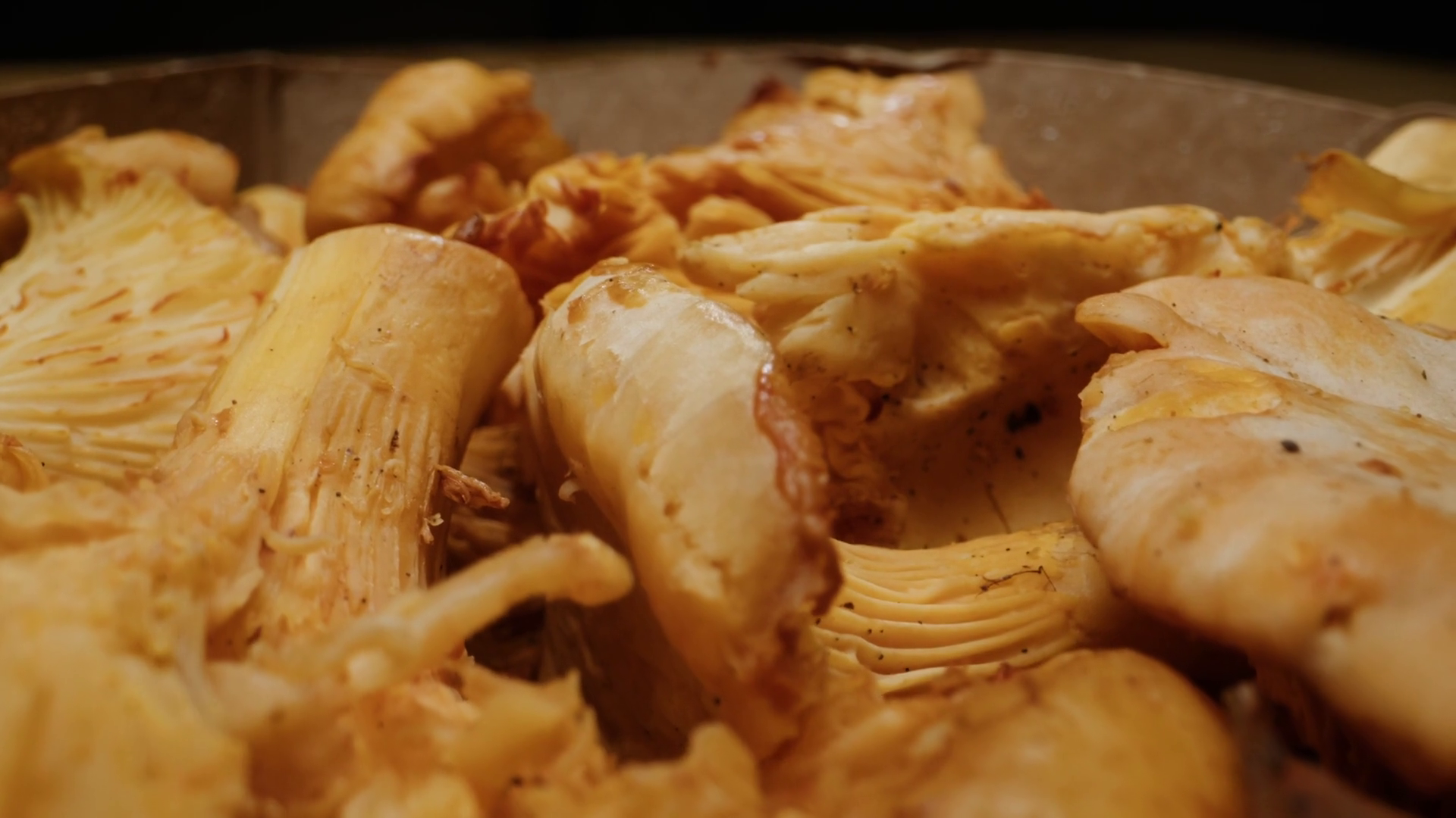 Cooking Chanterelles Closeup Macro Grilled Mushrooms Closeup Roasted Chanterelles And A Wooden SpoonÂ