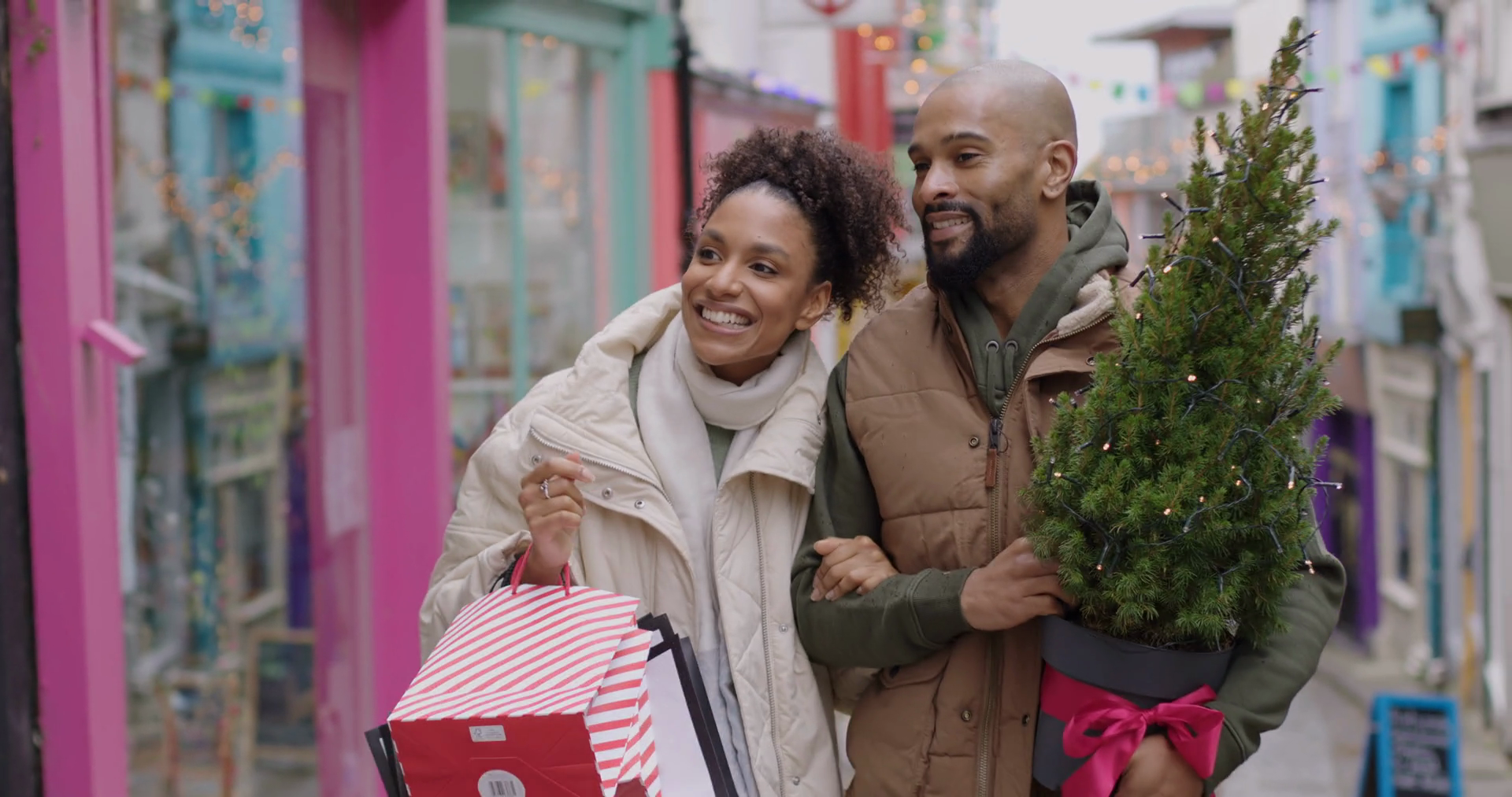 Couple Christmas Shopping In City Holding Christmas Tree And Shopping Bags With PresentsÂ