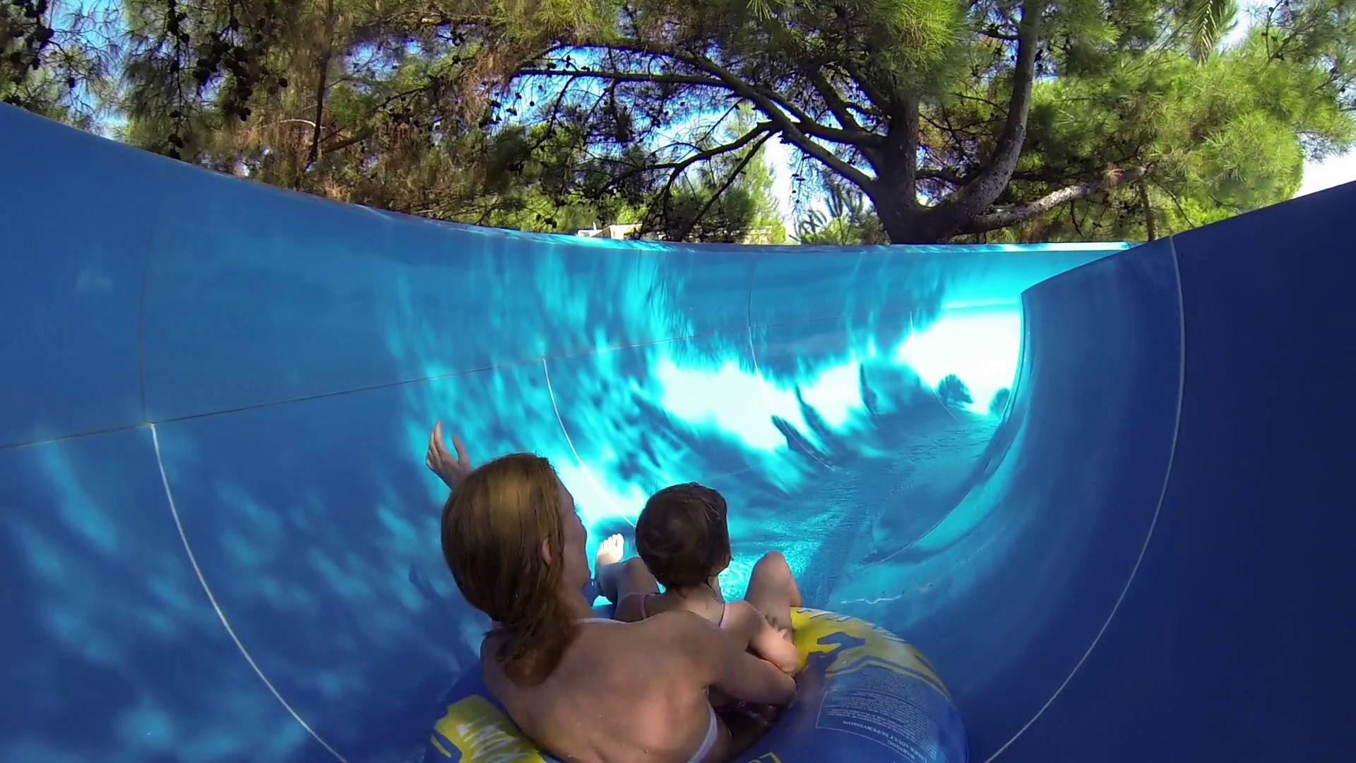 Exciting Water Race Mother And Daughter Enjoy Sliding Down The Water Slide