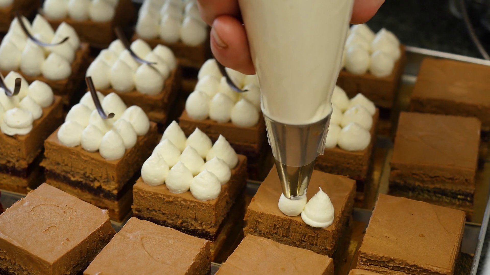 Cream Being Squeezed Onto Chocolate Cakes Squeezing The Cream On The CakeÂ