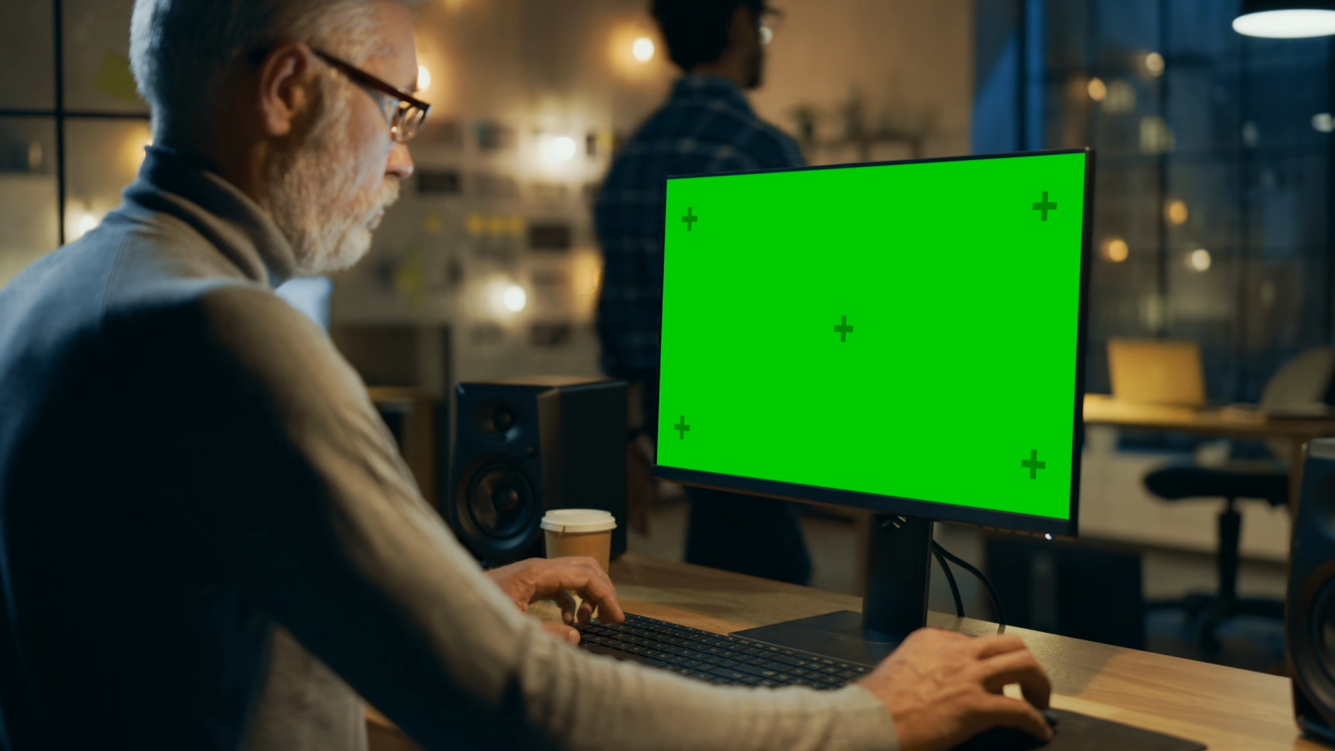 Creative Middle Aged Designer Sitting At His Desk Uses Desktop Computer With Green Mockup Screen In The Evening Two Creative Employees Working On Computers In The Office With Cityscape Window ViewÂ