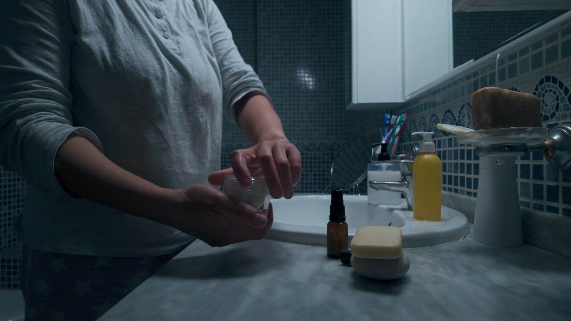 Daily Routine Of A Woman Applying Nighttime Skincare At A Bathroom SinkÂ