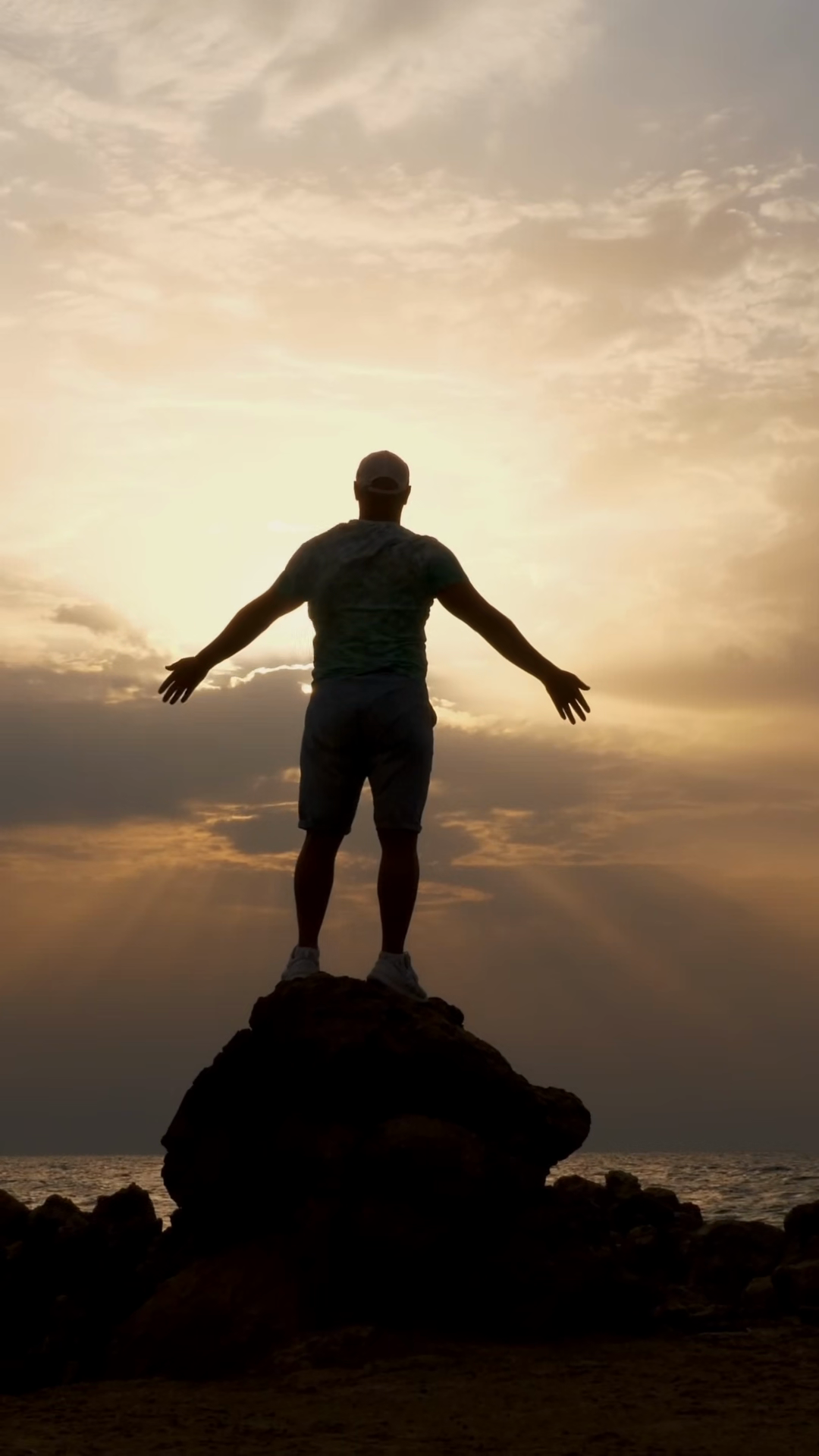 Dark Male Silhouette Man Stands On Rocks In Front Of The Ocean Or Sea With His Arms Outstretched And Hands Up At Dawn Sunrise Concept Of Human Strength And FaithÂ
