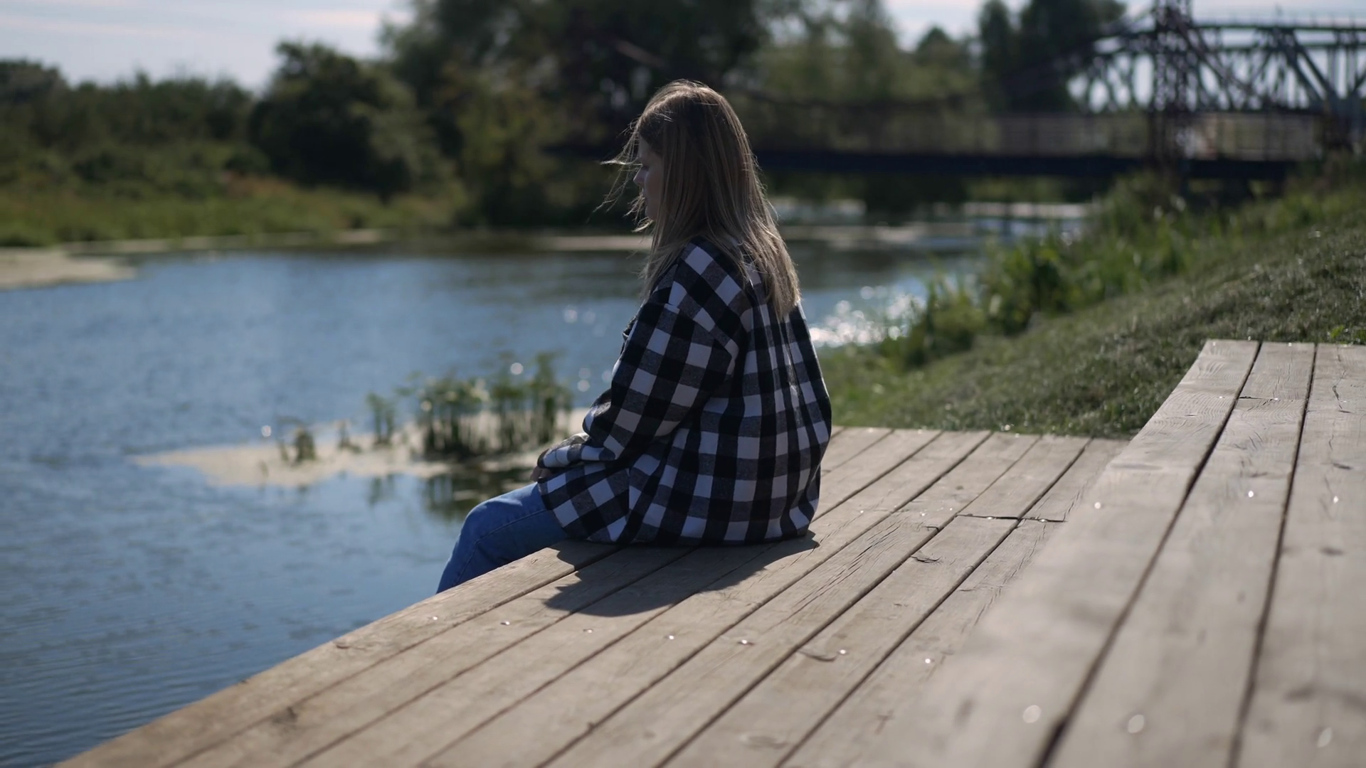 Young Woman Sitting On Pier Throwing Rocks In River Side View Portrait Of Frustrated Lady In ParkÂ
