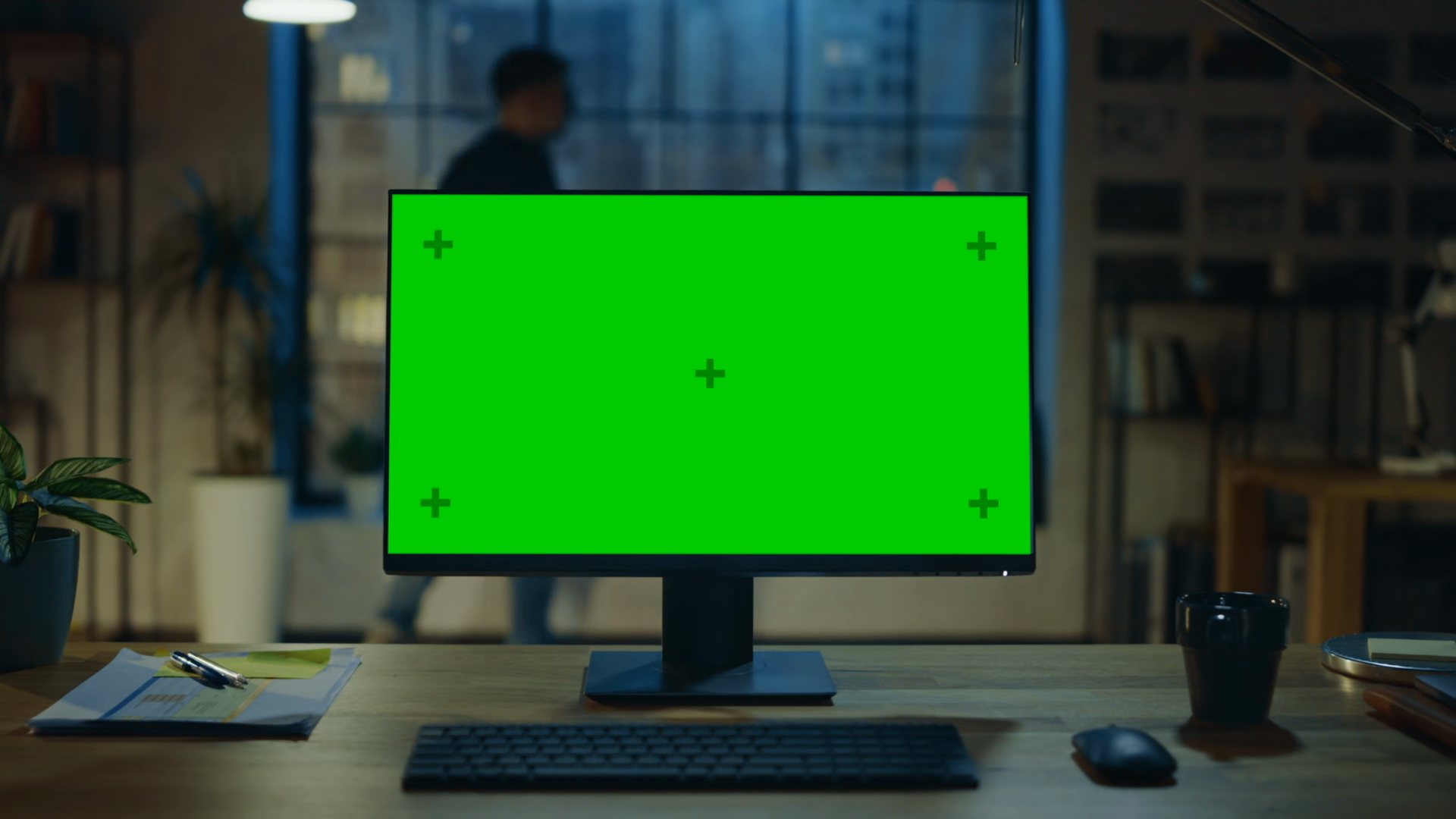 Desktop Computer With Mockup Green Screen Standing On The Desk In The Modern Creative Office In The Background Designer Drinks From A Cup Looks At The Night City Out Of The Window Zoom In ShotÂ