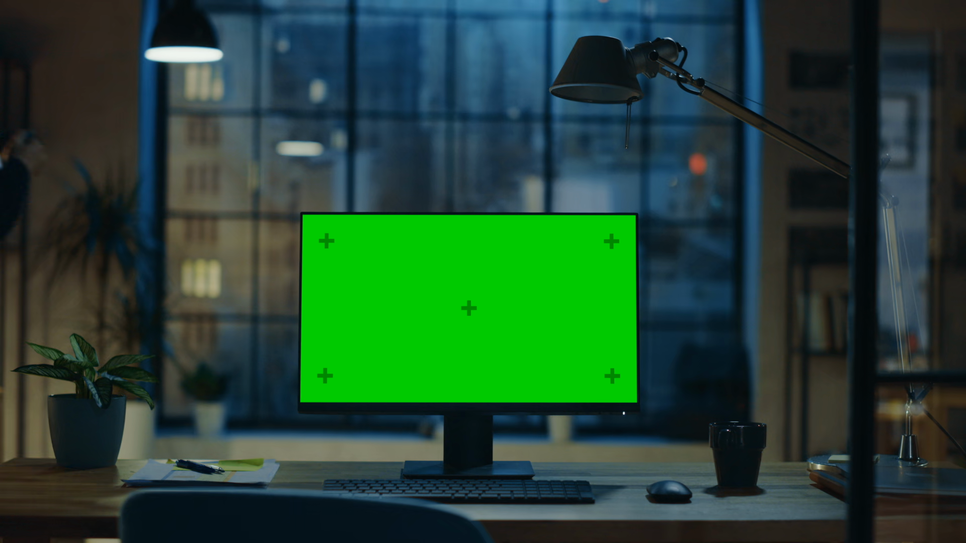 Desktop Computer With Mockup Green Screen Standing On The Wooden Desk In The Modern Creative Office In The Background Designer Drinks From A Cup Looks At The Night City Out Of The WindowÂ