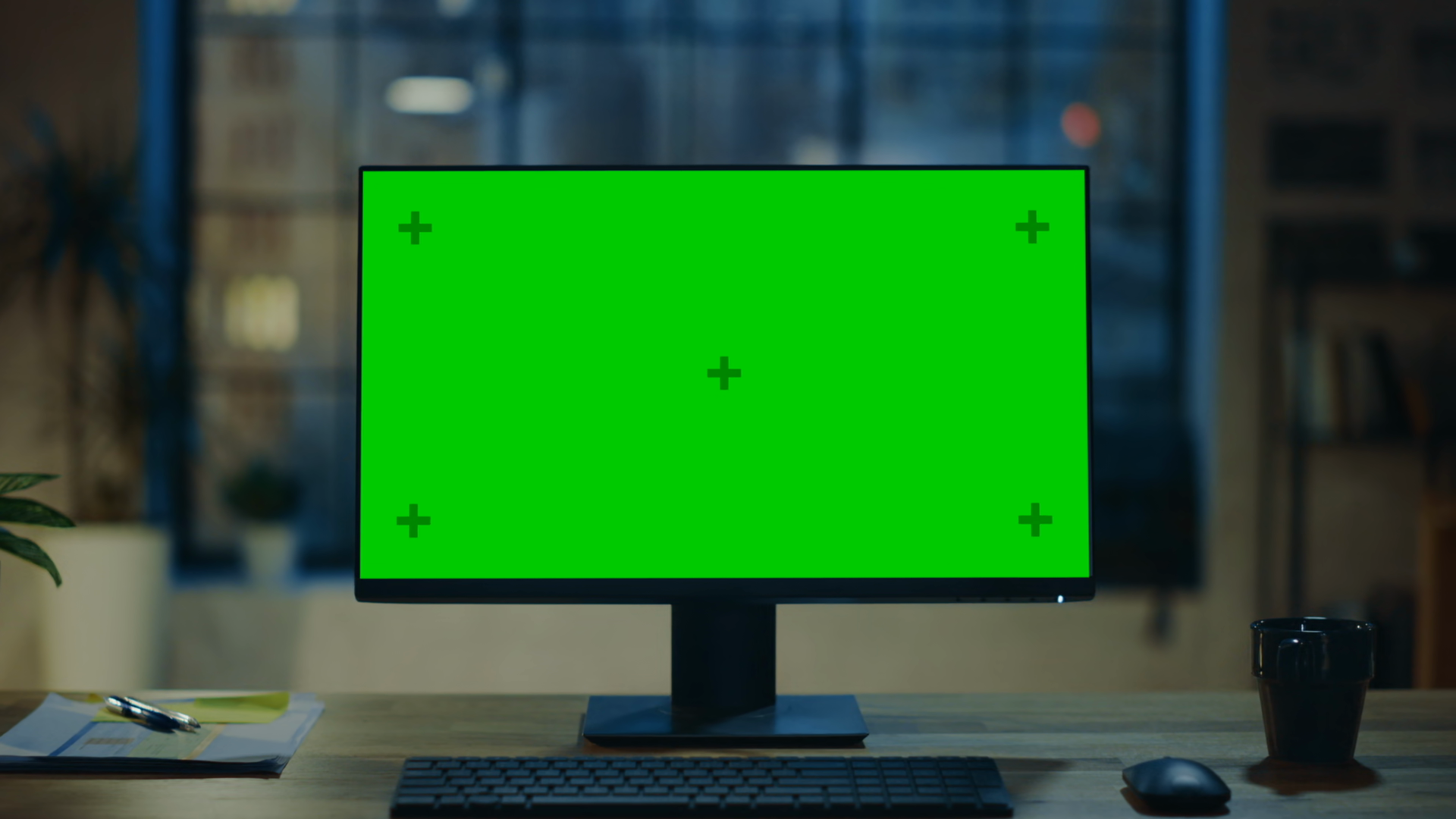 Desktop Computer With Mockup Green Screen Standing On The Wooden Desk In The Modern Creative Office In The Background Warm Evening Lighting And Open Space Studio With City Window View Zoom In ShotÂ