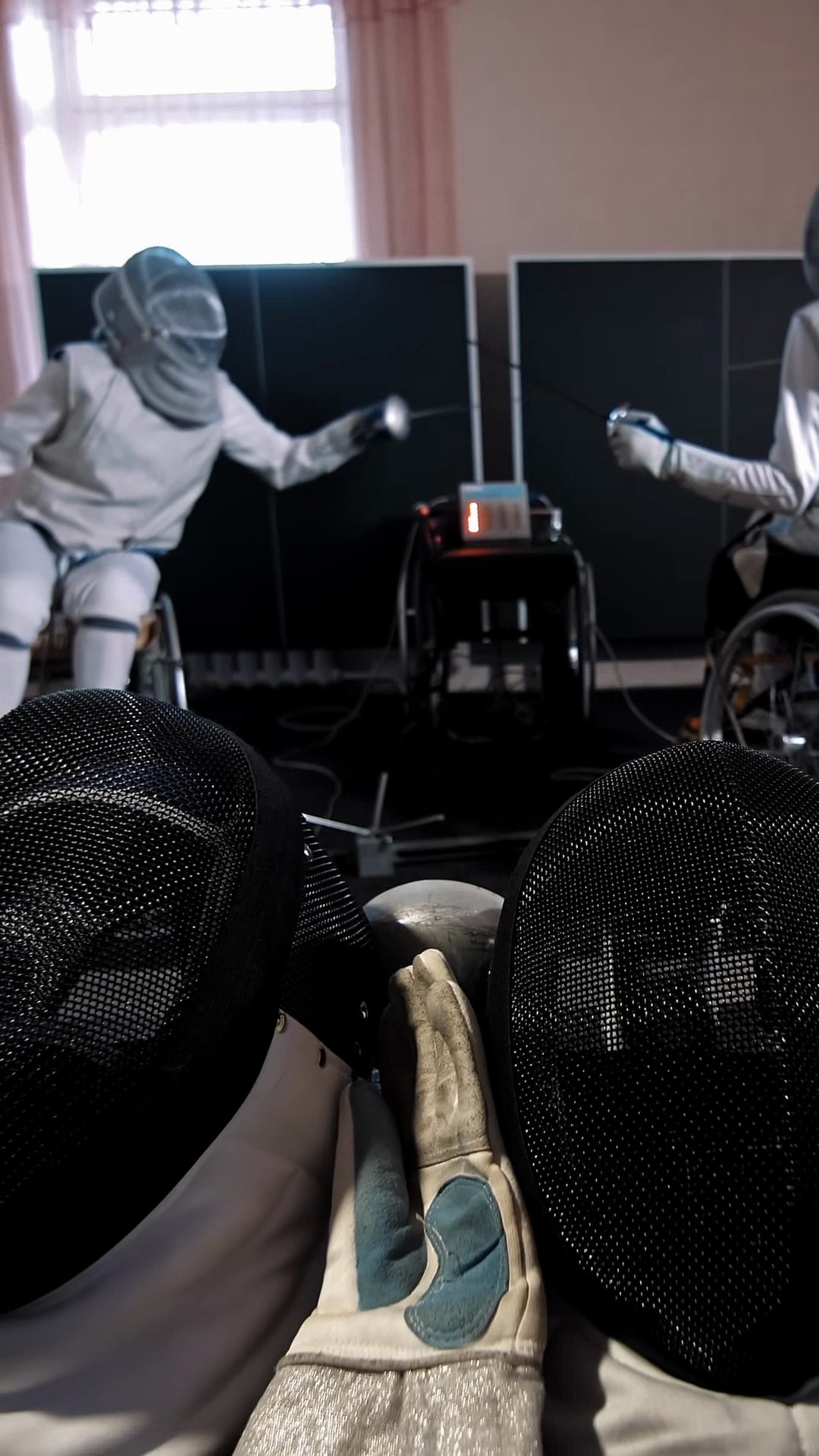 Disabled Athlete Fencing Equipment For Fencing Helmets Masks And Gloves Are On Backdrop Of Sparring Fencing Duel Of Two Wheelchair Fencing Athletes With Reduced Physical AbilitiesÂ
