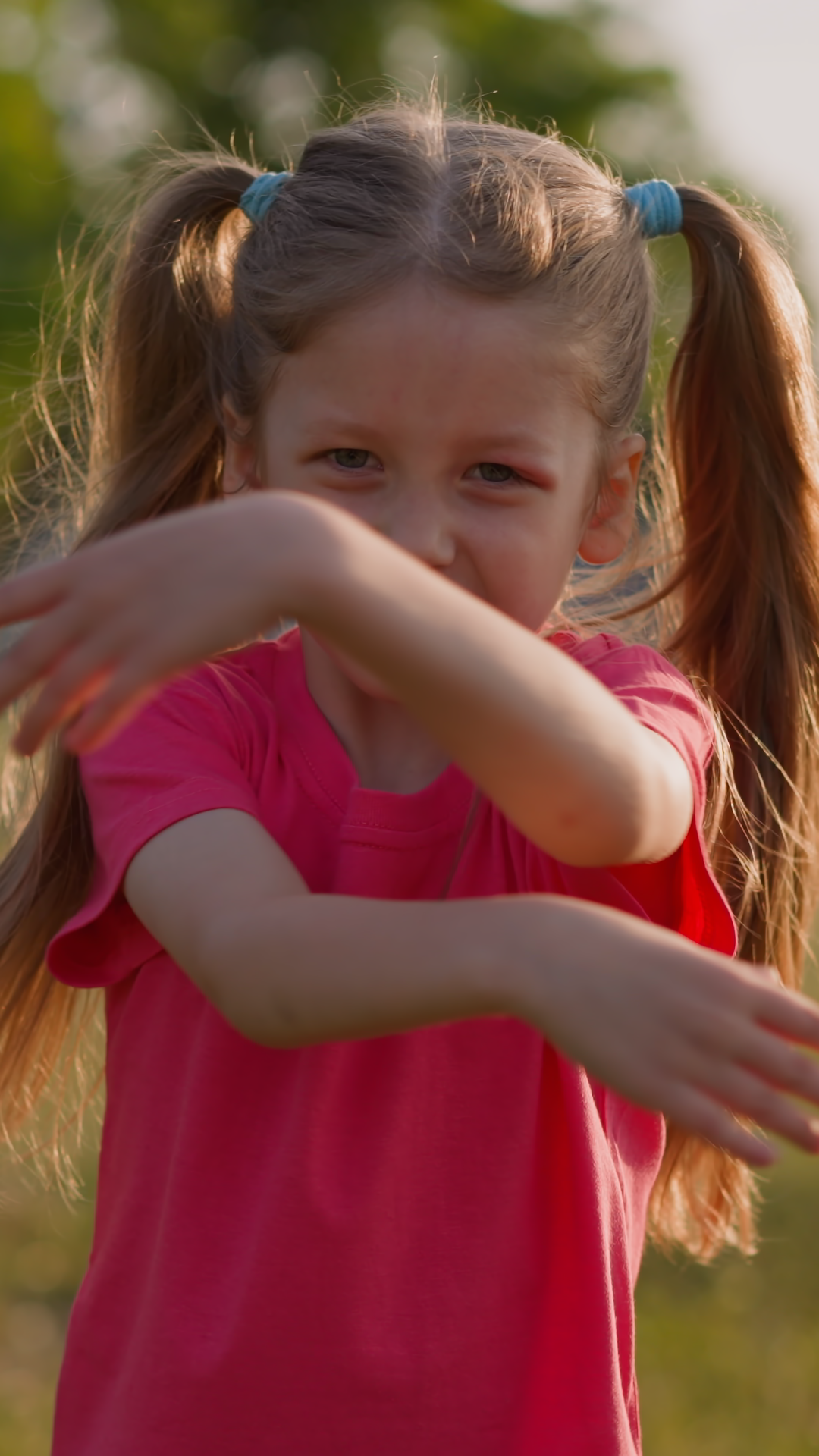 Disgusted Little Girl With Ponytails And Injured Eye Waves Off Annoying Insects On Green Lawn Child With Allergy Summer Season ProblemsÂ