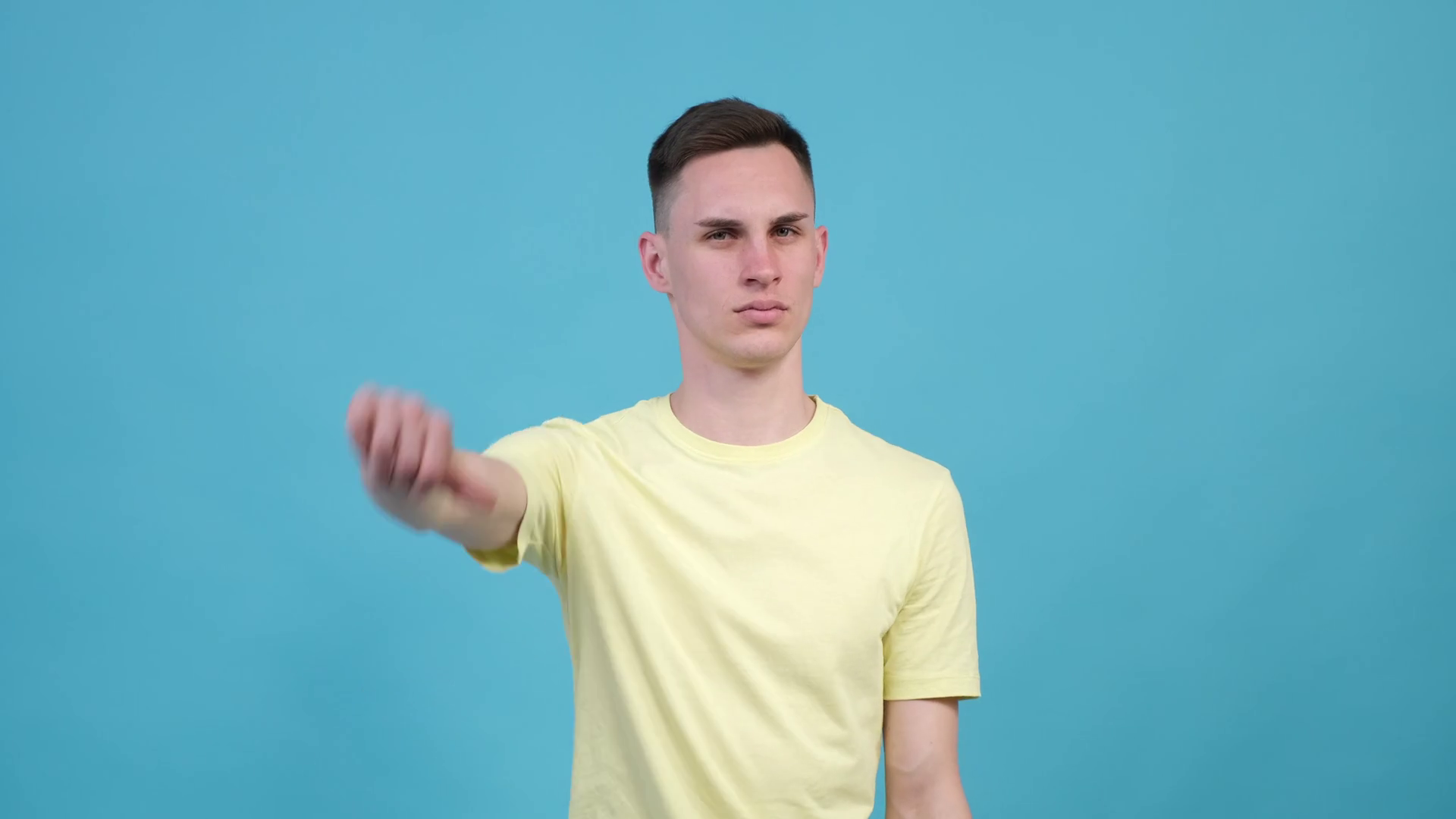 Displeased Caucasian Man Showing Thumbs Down In Disapproval On Blue BackgroundÂ