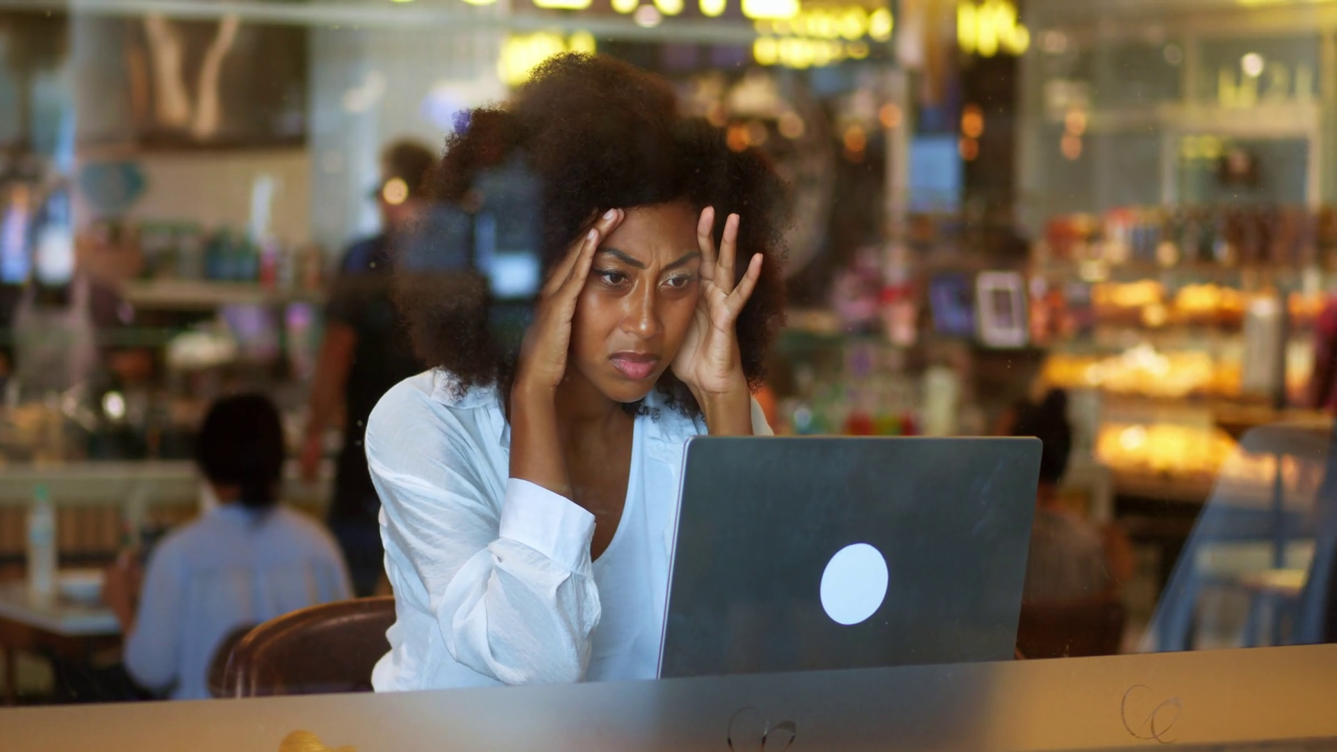 Distressed African American Woman Entrepreneur In Casual Wear Telecommuting On Laptop Sitting At Table In Coworking Feeling Distress