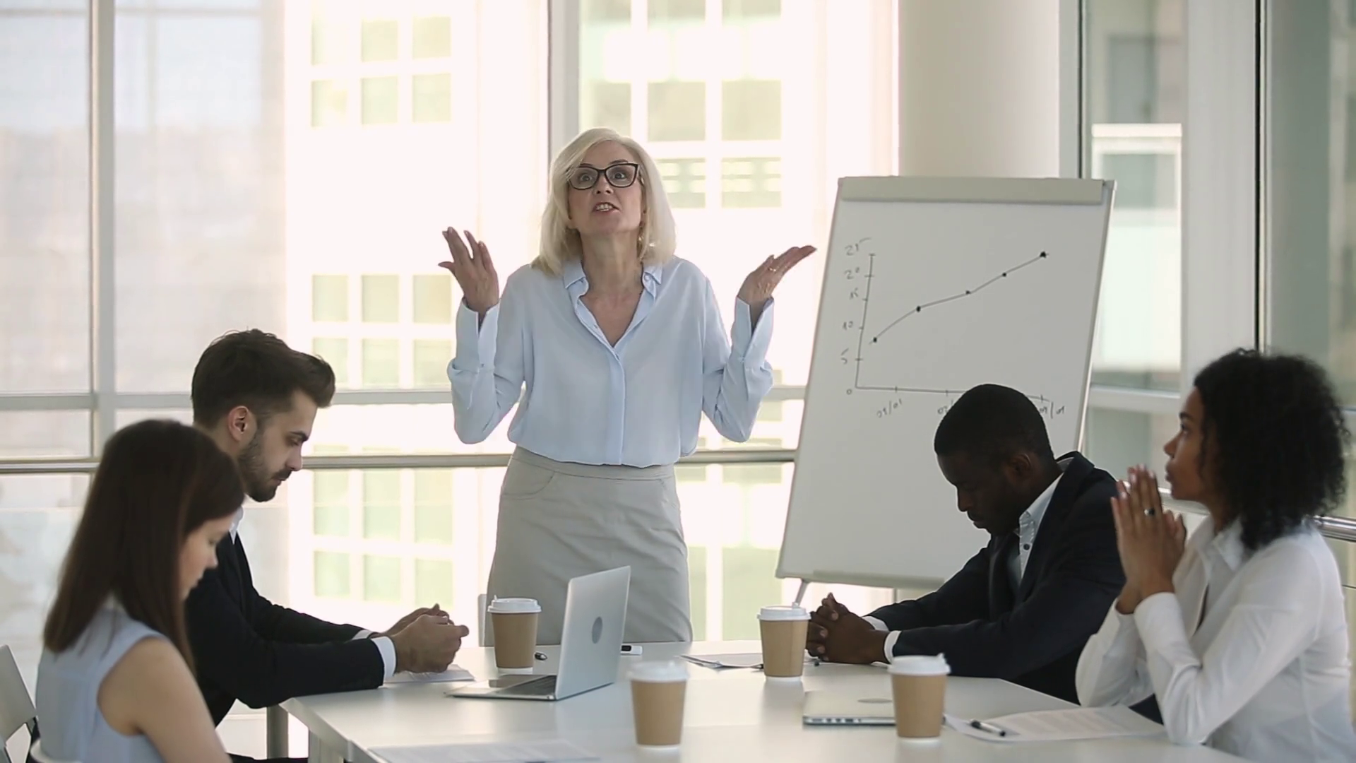 Diverse Employees Sitting At Table Scolded By Irritated Female BossÂ