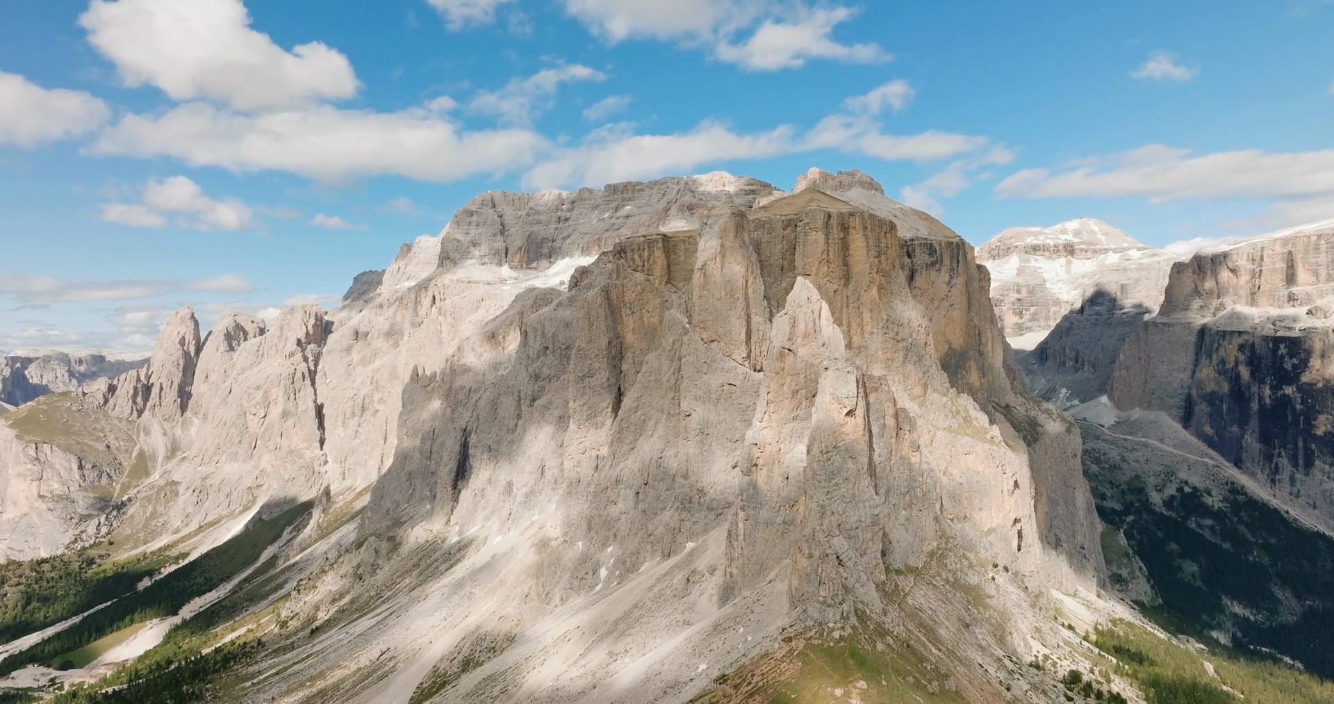 Dolomites Mountains Italy Alps Aerial View At On Sunny Day In Summer Against Blue Sky Grandeur Mountain Range Aerial View Panning Shot Of Beautiful Dolomite Mountain Range Tavel Tourism ConceptÂ
