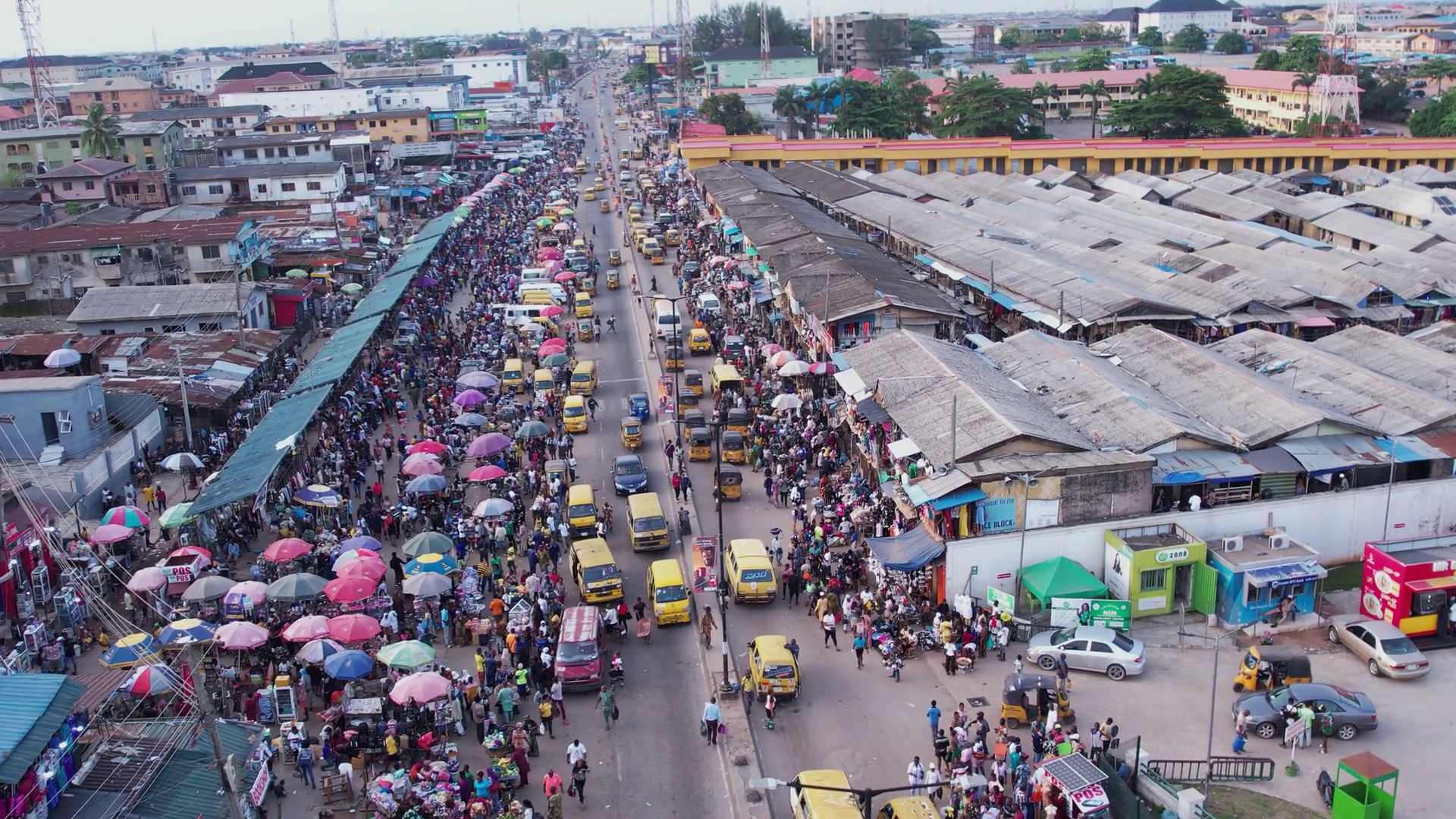 Drone Aerial Crowd Shot Of African People A Huge Queue Of Carstrucks Drive At Cross Road Traffic Highway Transportation In Nigeria AfricaÂ