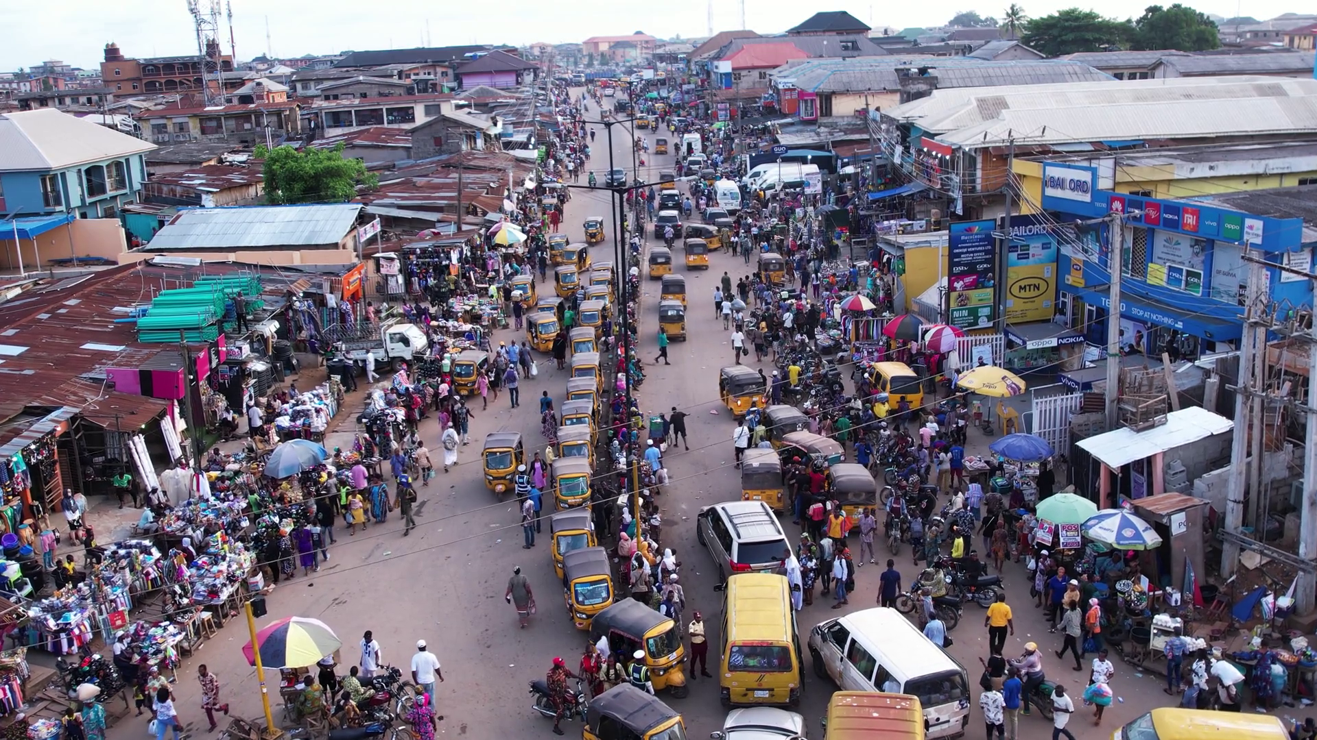 Drone Aerial Crowd Shot Of African People A Huge Queue Of Carstrucks Drive At Cross Road Traffic Highway Transportation In Nigeria AfricaÂ