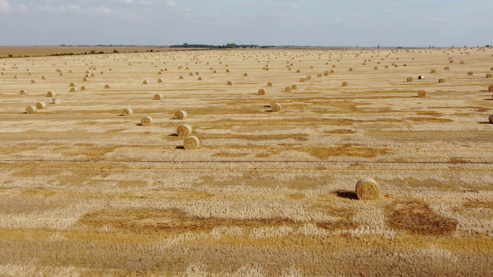 Drone Flight Over A Harvested Wheat Field With Scattered Circular Hay Bales For Livestock Feed In Winter Stretching Into The DistanceÂ