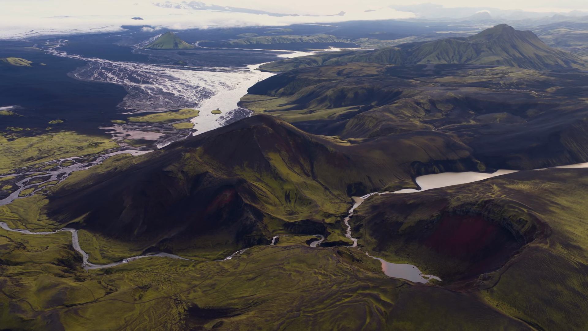 Drone Pans Over Icelands Volcanic Terrain Showcasing Green Mountains Dark Soil Winding Rivers And Craters In A Vast And Rugged LandscapeÂ